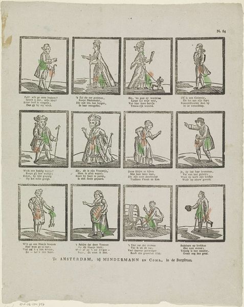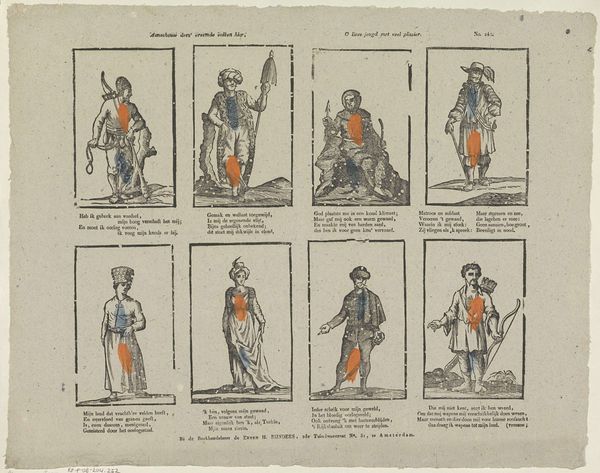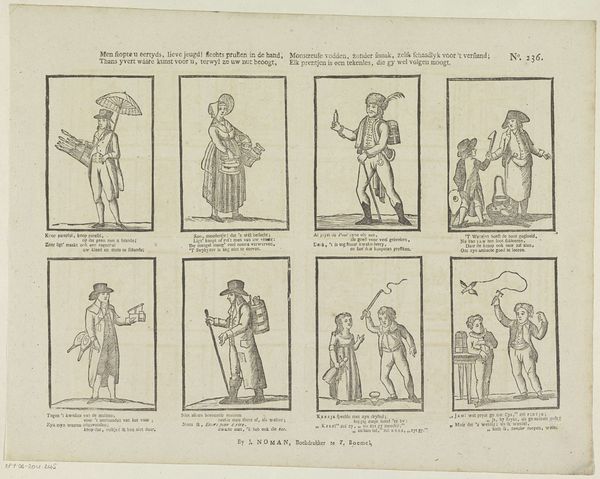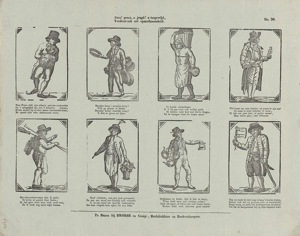 Editor: Here we have "Straatverkopers," or "Street Vendors," a print by Mindermann & Co., dating from roughly 1822 to 1849. It’s an engraving depicting eight different vendors, each in their own little scene. There is an immediate feeling of documentation to this artwork. How do you interpret this work within its historical context? Curator: I see it as a window into the everyday lives of working-class people in Amsterdam during the 19th century, a population often ignored in more "high art" depictions of the time. Look closely. What can we discern about the vendors’ social standing, their relationship to the city, and the overall economic landscape based on their gender and what they are selling? Editor: That's fascinating. I didn't initially consider the gender dynamics. Now I see how, for example, a woman sells flowers and another appears to be selling dairy, each in her own dedicated frame, maybe offering a glimpse of the roles they occupied in that era. Was this intended as some sort of social commentary? Curator: It’s difficult to say definitively. But the very act of portraying these vendors, accompanied by short verses, suggests an intention to both document and perhaps even humanize them. Consider the power structures at play. Who typically commissioned and consumed art during this period? How might an image like this challenge or reinforce existing social hierarchies? And where might this work be displayed in the Rijksmuseum that might enhance that commentary? Editor: It is interesting to think about it that way, as almost a political act in its own way, showcasing those who are normally overlooked. Curator: Precisely. And reflecting on our own position as viewers. How do our contemporary values and understandings shape the way we interpret this seemingly simple depiction of street vendors? Editor: This reframing helps me appreciate how even seemingly straightforward artworks can offer intricate layers of social and historical meaning. Thanks for walking me through your insights! Curator: My pleasure. It's crucial to consider all viewpoints.