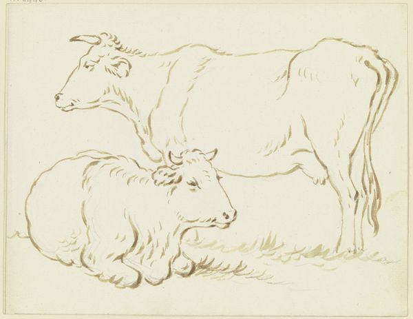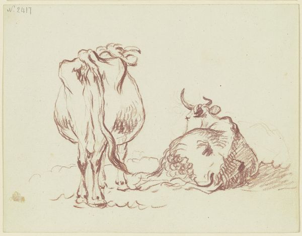 Curator: This is John Singer Sargent’s sketch, "Sketches of Cows; verso: Landscape with Furniture," housed here at the Harvard Art Museums. Editor: It has a very casual, almost hurried energy to it. The cows seem captured mid-thought, relaxed and earthy. Curator: Precisely. Sargent, primarily known for his society portraits, also dedicated himself to landscapes and scenes of rural life. The use of graphite on paper here points to a directness, an immediacy in his process. Editor: The very choice of subject matter—livestock—shifts our focus away from the polished veneer of his commissioned work. It seems to explore labor, perhaps the agricultural industry that supported the gilded age. Curator: One could interpret it as a commentary on class and labor. It could also be that he wanted to capture the beauty of the animals themselves, without the trappings of wealth and status. Editor: It's fascinating to see such a master engage with the quotidian materials and subjects. I wonder what it tells us about his overall artistic vision. Curator: A glimpse into the world beyond the elite circles he often depicted, perhaps. It underscores the multifaceted nature of his artistry.