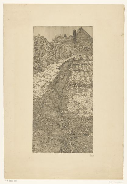 Editor: This is Chris Lebeau's etching, "Kijkduin," created sometime between 1888 and 1945. I'm struck by the contrast between the delicate lines of the reeds and the broader strokes defining the distant hills. It has this rather quaint, old fashioned feel. What are your thoughts on the socio-cultural implications behind it? Curator: Well, seeing this through a historical lens, "Kijkduin" places itself within a crucial period of artistic and societal change. Consider that etchings and prints like these were widely accessible. Lebeau wasn’t just depicting a landscape, he was contributing to a visual culture. This modernistic portrayal becomes part of an ongoing narrative. It allowed more people to experience and perceive the world around them, forming or reinforcing the modern individual's connection to nature, as shaped by societal values of leisure and tourism. Do you notice anything specific about this connection as constructed by Lebeau? Editor: It feels deliberately composed, rather than a completely natural view, which may relate to a shift towards organized leisure and the creation of tourism? The flowing water suggests a deliberate control of the landscape... Curator: Exactly. Water management in the Netherlands has a long and complex history. Here the artist highlights managed landscape as something serene and enjoyable. Consider the social and economic developments of the time - expanding infrastructure, increased urbanization and what do you make of Lebeau framing nature so definitively within the human project? Editor: So the artwork does not present pure landscape; it rather represents cultural attitudes toward nature and its societal importance? It shows control as a desirable feature, reflecting a wider effort to tame our environment? I'd previously only thought of its visual appeal but thinking about society's perspective certainly is compelling. Curator: Precisely. Recognizing those viewpoints enriches the image for our appreciation of past and present contexts and perspectives.