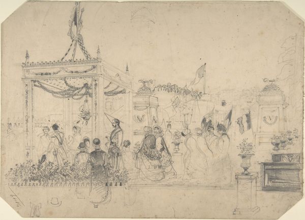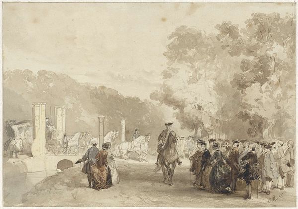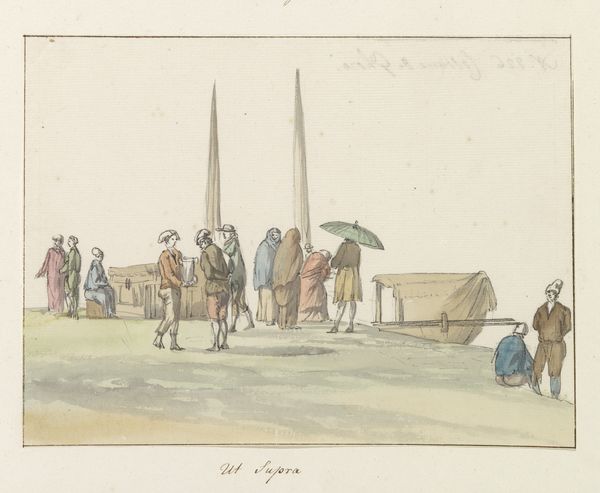 Curator: Eugène Boudin, born in 1824, captured this scene, "Promenaders on the Beach," with what looks like a quick hand. Editor: It feels unfinished, ephemeral. Like a fleeting moment, barely there. What strikes me first is the sheer amount of brown wash used. Curator: Well, brown was a common underpainting color, providing the base for the figures. The umbrellas stand out, don’t they? Little canopies of status, shielding delicate complexions. Editor: Status, yes, but also labor. Someone had to weave those umbrellas, dye the fabric, construct the frames. Think of the social stratification embedded in each parasol. Curator: True, but consider too the beach itself. For centuries, the ocean was seen as dangerous, and now it's a place of leisure. Look at the figures posed against the horizon: a powerful symbol of possibility. Editor: I hadn’t considered the symbolism of the location. I was so focused on the construction of the images. Thank you, that’s a helpful insight. Curator: And thank you, I had not thought about the labor involved!