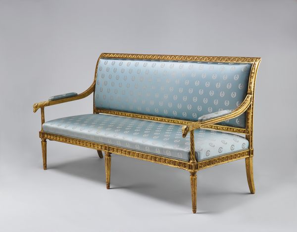 This Canapé, with its unknown maker, presents us with a fascinating tableau of symbols woven into domestic life. The cherubs and garlands adorning the fabric are more than mere decoration; they are carriers of classical memory. These motifs, deeply rooted in antiquity, resurface here, echoing the Renaissance's embrace of classical forms. We see cherubs, reminiscent of ancient depictions of Eros, gods of love, intertwined with garlands, symbols of celebration and the cyclical nature of life. Yet, in this domestic setting, their meaning shifts slightly. The cherubs, once powerful figures of desire, are domesticated. No longer harbingers of chaos, they become emblems of a refined sensibility. The garlands, though still celebrating life, are tamed into a pattern, controlled and orderly. This taming of powerful symbols reveals a deep human impulse to manage and make peace with the chaotic forces of life. A reminder of the past, reshaped and repurposed for the present.