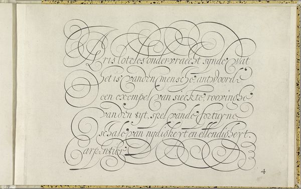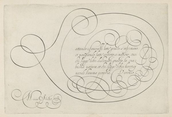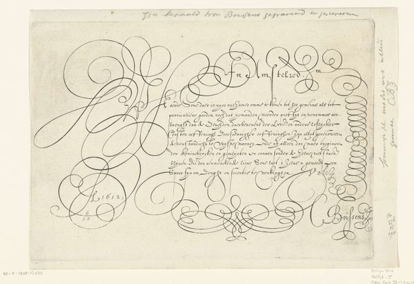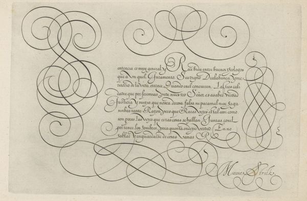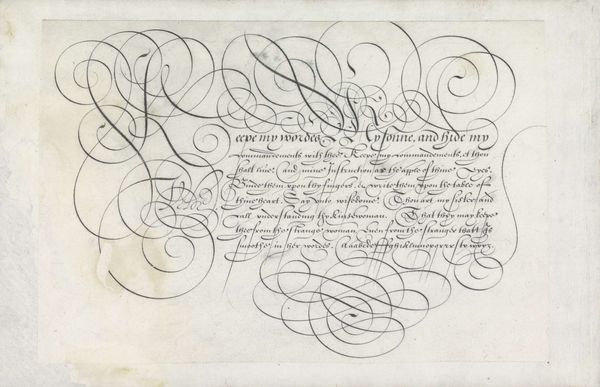 This is a writing sample with a capital K, made by Hans Strick around 1600, using pen and ink. During the late 16th century, calligraphy wasn't just about communication, it was a performance, a visual display of skill and education, closely tied to social status. In a society governed by strict hierarchies, handwriting became a means of asserting identity and belonging to a certain class. The flourishes and the elaborate letterforms weren't just decorative; they were a language in themselves, understood and appreciated by the literate elite. The act of writing was slow and deliberate, imbued with personal expression. The beautifully rendered ‘K’ and the careful script below are a testament to Strick’s mastery, and to the cultural importance of the written word. Consider the hours of practice, the expense of materials, and the cultural value placed on literacy during Strick’s time. This artwork invites us to reflect on the changing nature of communication, and the complex relationship between art, skill, and social identity.