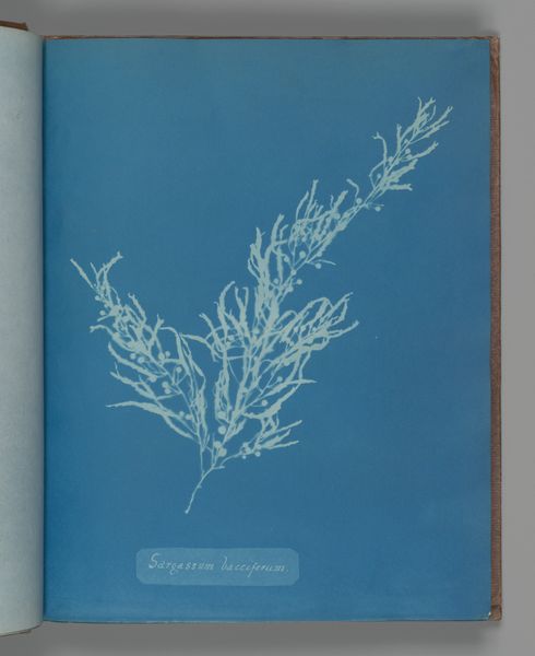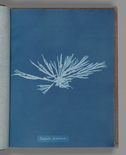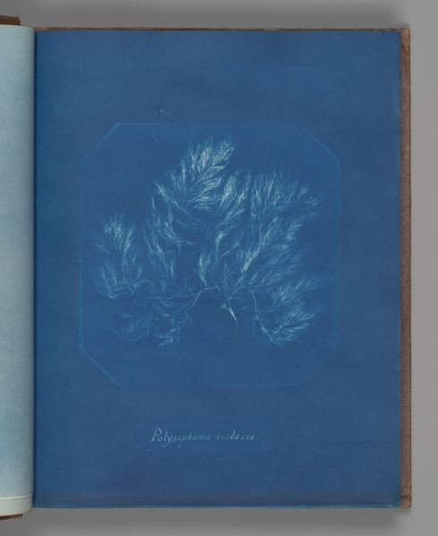Curator: Immediately striking! It's ghostly, like a memory barely clinging to the deep blue. Is this one of Atkins' cyanotypes? Editor: It is indeed. This piece, "Bangia fusco-purpurea," comes from a series created by Anna Atkins between 1851 and 1855. She pioneered the cyanotype process, using it extensively in her botanical studies. Curator: It’s essentially a photogram, right? Placing the seaweed directly onto sensitized paper. Editor: Precisely. The printmaking underscores the labor and the direct interaction between nature and the artistic process. I'm fascinated by Atkins’ dual role as both a scientist and artist. She was meticulously documenting algae specimens. We could analyze the rise of scientific methods through mass media at the time and explore its commercial applications through botanical illustrations for wide consumption. Curator: Yes, and consider the context—Victorian society's obsession with categorizing the natural world. But even setting that aside, look at the composition! The way the delicate structure of the algae contrasts against the intense blue... It’s arresting. The blue functions almost as a void, isolating and emphasizing the fragile form. It also begs semiotic questions like "what do these particular specimens represent?" Editor: A void maybe but what kind of work did Atkins have to undergo to present us with that kind of symbolic tension? As the cyanotype process became available for industrial applications such as reproducing diagrams or textual facsimiles, how does her approach resist standardized, commodified productions by imbuing them with a certain artistic touch? Curator: Still, the pure contrast and intricate details captured are so evocative. What’s rendered is that translucent texture of the seaweed and that specific shape it adopts to deal with fluid mechanics underwater... A feat given the rudimentary technology and equipment that she worked with. Editor: But to focus solely on formal elements neglects the broader implications. Atkins wasn’t just creating pretty pictures. She was disseminating scientific knowledge at a time when access to such information was limited, especially for women in scientific fields. This could have been an assertion against limited opportunity through the embrace of the traditionally gendered practice of arts! Curator: You're absolutely right, and that socio-historical context adds another layer of richness to the work. I see now it becomes more than just an aesthetically pleasing image; it's a product of its time, reflecting scientific advancement and cultural biases, and then critiquing both through both artistic practice and professional pursuits. Editor: Precisely! I appreciate now that you appreciate Atkins' mastery lies not just in her technique, but in her strategic deployment of it. This photograph encapsulates this tension that I find personally riveting.