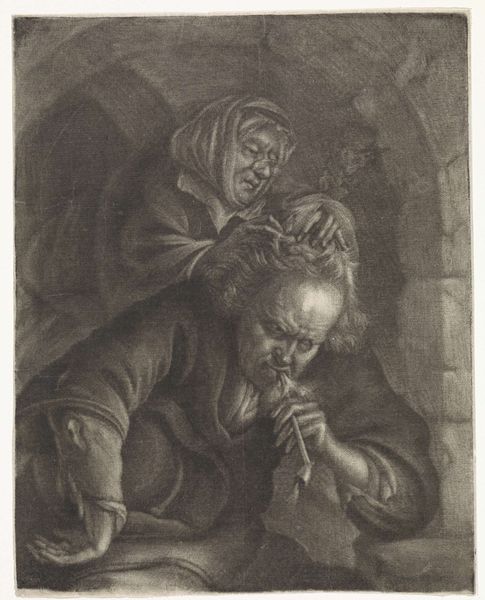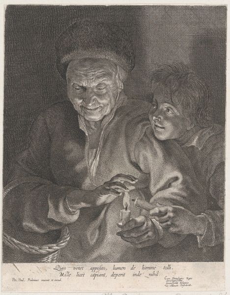 Editor: This painting, titled "A Boy lighting a Candle from one held by an Old Woman" is attributed to Peter Paul Rubens. It’s quite dark, with the figures illuminated by the candlelight. I'm curious about the way the light functions, it feels like it creates the narrative itself. What strikes you most about this piece? Curator: The tenebrism is certainly notable. Look how the dramatic contrast between light and shadow defines the composition. Notice how the light source, the candle itself, dictates not only the areas of visibility but also the emotional tone. The artist isn't simply depicting a scene, they are structuring a visual experience, playing with forms created by the illumination. What do you make of the surface? Editor: I hadn't considered that. You're right. The visible brushstrokes create texture that almost feels tactile, especially in the way the light catches them. Does the candle perhaps have any symbolic meaning that Rubens might be suggesting? Curator: The candle serves multiple formal purposes. It sculpts the figures, but look closer, how the artist used the gesture of holding the candle as a focal point of this structure, an index, of sorts, where our reading starts and finds resolution. What else stands out to you in regards to form? Editor: I see what you mean. The soft lines on the old woman's face tell almost a completely different story than that of the angular composition created between the two figures, who are enclosed in darkness... It seems the very essence of the artwork stems from its very own artificial light source. Curator: Indeed. Focusing on form and materiality reveals levels of artistic intention. Rubens doesn't just present figures; the light from the candle actively dictates how we see and experience them, which structures the semiotic understanding that comes afterwards.
