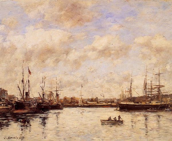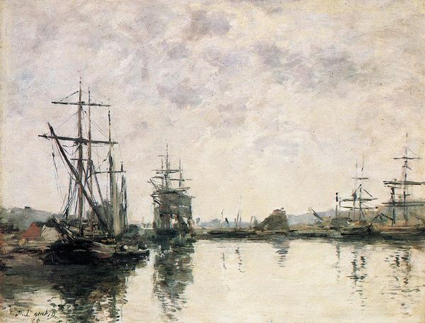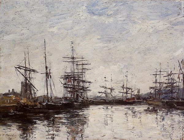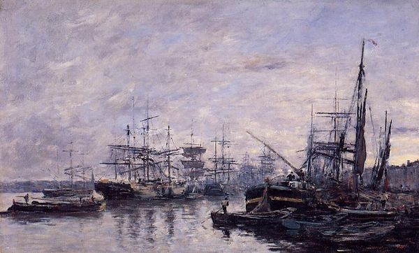 Curator: Let’s take a look at Eugène Boudin's "The Port of Le Havre at Sunset," created in 1882. He captures a scene awash with the day’s final light, an example of his dedication to plein-air painting. Editor: Immediately, the painting evokes a certain placidity, a stillness only disrupted by the soft strokes of color composing the sky. There’s a distinct lack of sharp lines; everything seems to melt into everything else. Curator: Indeed. Boudin was fascinated by capturing the ephemeral qualities of light and atmosphere. This work exemplifies the rise of maritime trade in France. Ports were vital arteries for colonial exploits and trade. Editor: Considering this historical context, I find myself particularly drawn to the verticality of the masts and the rigging against the broad horizontal stretch of the sea and sky. The ships appear caught, perhaps imprisoned. This creates tension and visual rhythm within the pictorial space. Curator: These visual elements echo the anxieties about imperial ventures. Ports, such as Le Havre, are locations of both progress and exploitation. The blurred effect that initially comes across as peaceful becomes slightly more uneasy as it highlights instability and fluidity, particularly when understood in relation to colonial exploitation and expansion. Editor: I concur. I appreciate your observation about the ships feeling “caught,” as the sky itself is active, dynamic. Consider how the painter has carefully placed strokes of color; it guides your eye upwards in contrast with the comparative calm of the water, and this is enhanced through tone and hue, not outline. Curator: Boudin offers us an entry point to consider the environmental impact of the expansion. This painting also acts as a record, subtly indicating what these industrial endeavors took from the communities that fostered them. Editor: By focusing so closely on the light and atmosphere, Boudin has given us something visually seductive while subtly evoking a critical framework when contextualized appropriately. Curator: Precisely, its artistic value lies in its capacity to open avenues for dialogue about the intersectional dimensions of culture and history. Editor: Ultimately, it invites us to look beyond the surface, and contemplate how visual forms articulate layers of social complexity.