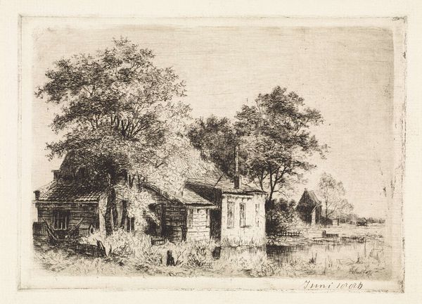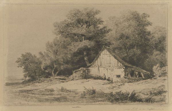 Curator: This is “Farmhouse by a Road”, an etching attributed to Remigius Adrianus Haanen, likely created sometime between 1827 and 1879. Editor: It’s quite evocative, isn't it? Melancholy, perhaps? The impending storm, that lone figure on the path… It makes you wonder about rural life at that time. Curator: Indeed. Etchings like this were important for circulating images of the countryside and shaping urban perceptions of rural life. They speak volumes about the socio-economic realities facing agricultural communities during that era. Consider the political implications around land ownership. Editor: Certainly, and even within the genre of landscape art, choices were made. We see a modest dwelling; no grand estate. It almost feels documentary in its detail. What can we infer about the status of these families who likely worked that farmland? Curator: Exactly. The artist, Haanen, came from a family of painters, so he understood the artistic conventions. However, pieces like this reflect broader concerns within 19th-century society: urbanization, industrialization, and the displacement of rural populations. Who exactly was his intended audience? And what did they make of this image of rustic life? Did it inspire romanticism, or a call to reform the poor state of the country folk? Editor: Perhaps both, depending on the viewer. The composition reinforces that dichotomy. The darkened sky, the almost dilapidated buildings... It could be viewed as a commentary on the neglect of the farming class. There's also a strange beauty though, isn't there? Curator: Definitely. Haanen’s technique is superb, even if its message is multi-layered and at least somewhat ambivalent. The contrasts he draws between light and shadow, the texture achieved through etching - they are striking. Editor: Seeing this etching makes me think about how we continue to grapple with similar social disparities today. Land access, environmental justice... This scene resonates across time, a constant cycle of exploitation, in many instances, for vulnerable members of our communities. Curator: Precisely. These older works act like mirrors reflecting how far we've progressed as a society, or not, while questioning who continues to be disenfranchised today.