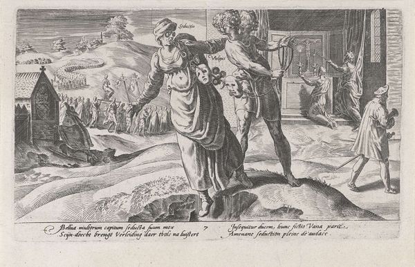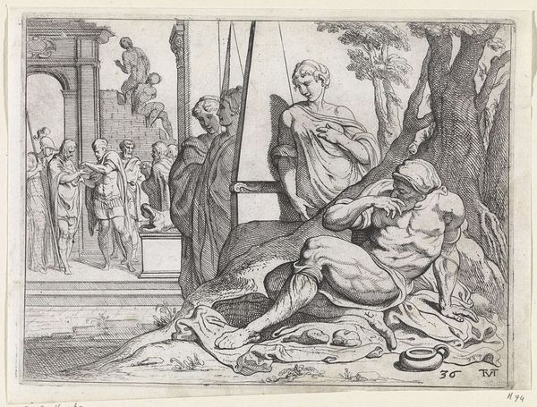 Dirck Volckertsz Coornhert created this small engraving, "Uit godsvruchtigheid doet de mens zijn plicht," with incredible detail. The composition divides the scene into distinct areas that suggest different aspects of duty and piety. The central figure, labeled "Pietas," stands tall, holding a flame, visually dominating the scene. Note how the artist uses line and form to contrast her calm, vertical pose with the contorted bodies of the figures around her. To the left, figures are engaged in physical labour. To the right, a sick person receives care. The figures' actions create a semiotic system: piety is not just about religious observance but also social responsibility. The balance between the figures and Pietas suggests that only through diligence and care for others can one attain true virtue. Consider how Coornhert uses space and perspective to create depth, inviting us to reflect on the relationship between personal virtue and communal well-being. The artwork serves as a mirror, reflecting the values and virtues that society upholds and seeks to cultivate.