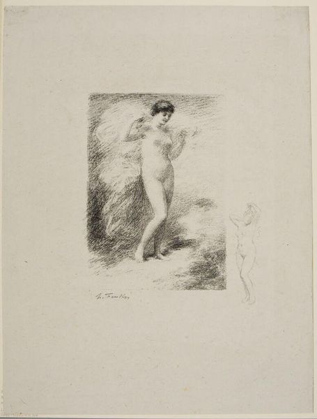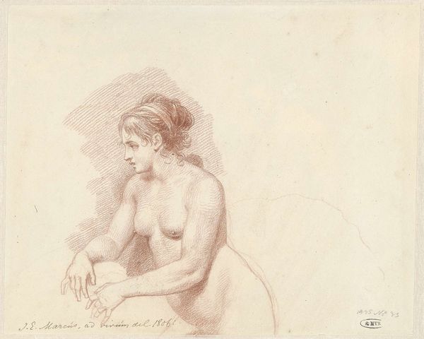 Curator: Denman Waldo Ross’s drawing, “Seated Male Nude in the Grass,” presents a figure nestled within a softly rendered landscape. Editor: It's remarkably delicate, almost ephemeral. The strokes of the graphite seem to breathe with the subject. You can practically feel the texture of the paper itself. Curator: Indeed. Ross seems less concerned with anatomical precision and more invested in conveying an overall sense of contemplative reverie. The hatching technique used to render the grass and foliage is beautiful in its simplicity. Editor: Graphite on paper – such humble materials, yet they yield this intriguing study of light and form. The artist's hand is so apparent, you can almost envision the labor and the slow accumulation of marks to create this image. Curator: It’s like a memory, faded at the edges, but deeply felt nonetheless. Editor: Yes, a reminder that even the simplest materials, when handled with skill and intention, can reveal profound depths.