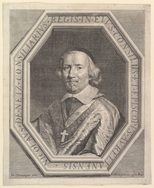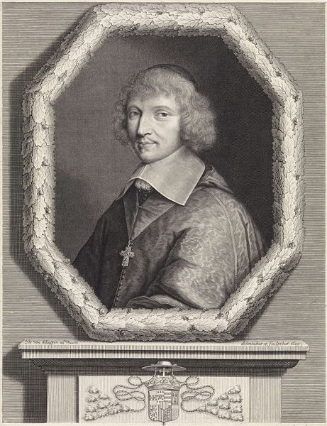 Curator: Here we have Robert Nanteuil's "Cardinal Antonio Barberini," an engraving completed in 1663. The portrait captures the cardinal within an elaborate, almost celebratory frame. What strikes you first about it? Editor: The overall feel is one of restrained power. Despite the ornate wreath and Barberini family crest below, the somber monochrome and the Cardinal's composed expression convey authority, rather than ostentation. Curator: Absolutely. Nanteuil, a master of the engraving medium, would have started with a metal plate, incising lines to create the image. The act of engraving is one that requires mastery to convey form and emotion as clearly as Nanteuil manages to do. He printed primarily portraits—the rise of portrait engravings coincided with a growing interest among the bourgeois to commission reproducible, affordable artwork of themselves. Editor: I find the Barberini crest below to be quite compelling as well. Each charge is quite symbolic: the bees symbolizing the family's dedication to hard work. How fitting given what we know about the process and production needed to achieve the crisp textures and shadows of this baroque artwork. Curator: A very relevant point about process and materials! Thinking about the crest, one wonders how conscious the average owner was of those emblems back then. To what extent did those status symbols hold weight outside the inner circles of nobility? Editor: The act of displaying such a portrait likely acted as a statement of values for anyone interested in obtaining and displaying one like it. Beyond that, this portrait reminds me of the Baroque era’s fascination with image-making as a form of legacy creation. These are images designed to last. Curator: Indeed. Through careful detail and artistry, Nanteuil manages to capture both the material splendor and the symbolic weight of Barberini’s position. Editor: It speaks volumes, even now. And it also prompts one to consider, from Nanteuil's perspective, the tension between craftsmanship and status, when so much material culture acted as shorthand. Thank you for elaborating on Nanteuil’s process—it really enriched my reading of it.