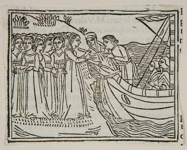 Curator: Here we have a rather striking image, an anonymous illustration titled "Book XXX.25. Ambassadors to Carthage receive two triremes for their return." Editor: It feels quite somber, wouldn't you agree? The stark black lines, the crowded figures, it all evokes a sense of weighty responsibility, perhaps even foreboding. Curator: Observe the lines themselves. The artist employs a simple, almost crude, technique. Parallel lines dominate, creating texture in the sea and suggesting form in the figures. Note also the dense composition, packed within the frame. Editor: Absolutely. The triremes, the horses, the armed figures...all suggest a return freighted with symbolic meaning. Swords often stand for authority, of course. But here, do they also signal conflict, the threat of war? Curator: That's an astute observation. It seems this visual narrative encapsulates the liminal space between diplomacy and potential aggression, wouldn't you say? Editor: Indeed. Ultimately, this piece reminds us that even seemingly simple images can carry profound cultural and psychological resonance.