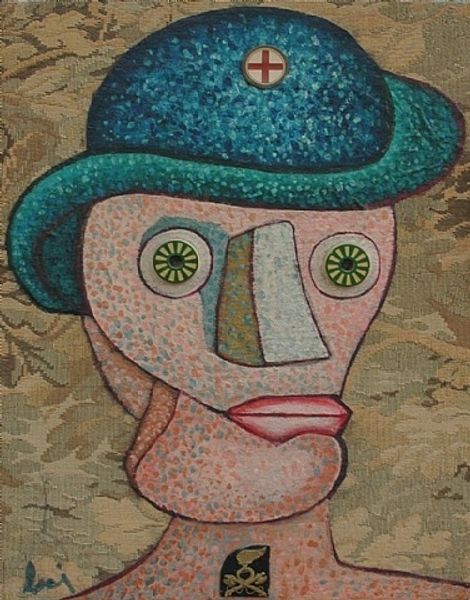Editor: So here we have Enrico Baj's "Jeune fille en fleur" from 1979, a mixed-media piece that really pops. There’s something almost playful about the textures and how the materials come together, though also a little unsettling in the caricature. How do you read this piece? Curator: For me, the appeal lies precisely in its construction. Notice the interplay between painting and found objects—fabric trim, what looks like plastic or glass for the eyes and embellishments, maybe some rhinestones. What labour went into selecting and combining these? Baj isn’t just depicting a young girl; he's crafting a commentary on representation through the act of making itself. Editor: I see that! It's more than just paint on canvas; it’s like he’s building a character. So the materials are part of the message? Curator: Absolutely. Consider the context: 1979. The art world was grappling with the legacies of Pop Art and the burgeoning interest in reclaiming craft traditions. Baj’s use of inexpensive, mass-produced materials challenges the traditional hierarchy between fine art and "lower" forms of craft or decoration. Is this girl idealized, or is Baj critiquing the materials with which we represent her? What assumptions do we make about status, value, and art when we see craft materials put together in this manner? Editor: That shifts my understanding completely. I was initially focused on the figurative aspect but missed how the *process* questions these norms. Curator: It also raises questions about labor. Who traditionally used these kinds of materials, and what kind of cultural capital did those activities possess? Editor: I guess I was thinking of "naive art" originally. Curator: It has some visual cues from that aesthetic movement, true, but remember to engage critically. By making such direct material choices, what exactly is Baj telling us? Editor: This has opened my eyes to interpreting art beyond just subject matter, considering the social commentary inherent in material choices and production processes. Thanks! Curator: My pleasure. Keep looking beyond the surface, and you'll find that materials always speak volumes.