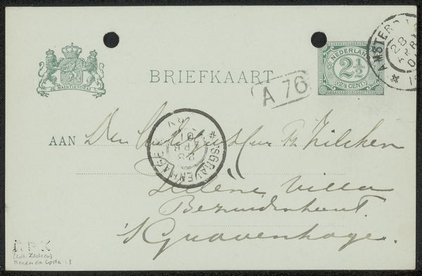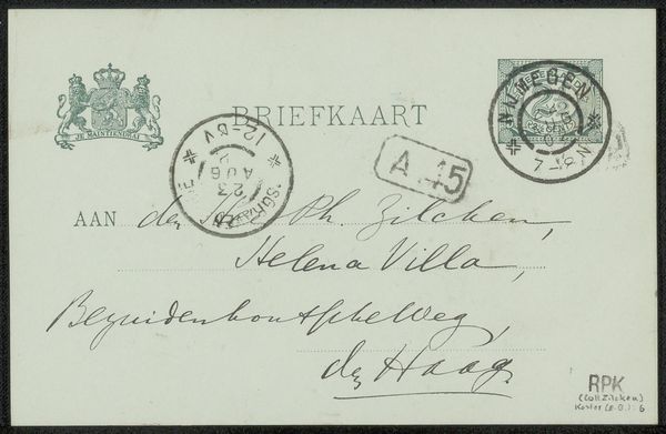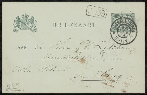 Editor: This is "Briefkaart aan Philip Zilcken," thought to be from around 1904. It's an ink drawing on paper. Looking at it, it reminds me of historical documents with all the stamps, handwritten address and royal seal; a little piece of someone's life preserved on paper. What significance do you find in this kind of ephemera? Curator: Precisely, it’s an interesting question about cultural memory. Postal markings, official seals… each one becomes a small monument to bureaucracy and communication norms of the era. That seal, for example, connects this simple postcard to the larger narrative of the Dutch state. The address itself also anchors it to a specific time and place. Doesn't the handwriting also evoke a sense of intimacy, lost now, in our age of digital communication? Editor: It does. And the marks left by the postal service! Smudges, numbers. Were postcards like this common at the time? Curator: Postcards were a booming medium. This card would have represented not just a message, but a tangible link, carrying with it the spirit of its sender across geographical space, carrying also a status through calligraphic conventions to "the honorable Gentleman, Mr. Ph. Zilcken." What symbols do *you* think will represent *our* current era in a hundred years? Editor: I hadn't thought of that. Maybe screenshots? So much communication is digital. I find the connection you make to shared cultural practice very thought provoking. Curator: And I find *your* initial read on how “life” is preserved here particularly resonant. Perhaps these humble artifacts tell us more about ourselves than we realize.