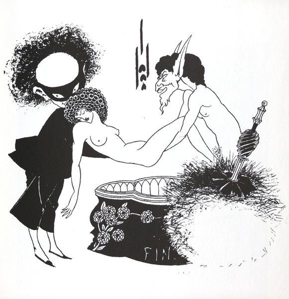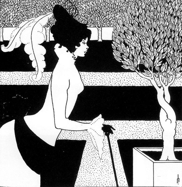 Aubrey Beardsley created this pen and ink drawing, Madame Rejane, using stark black and white contrasts. The composition is split into sharply defined areas. On the left, a dense tree and winding path create depth, while the right features the figure of Madame Rejane and a hanging tassel, emphasizing flatness. Beardsley’s approach to form here is fascinating. He plays with positive and negative space to create visual tension. The solid black areas intensify the detailed linework of the figure and the landscape. The exaggerated features of Madame Rejane, combined with the artificiality of the setting, suggest a critique of representation itself. The drawing functions as a sign, with Beardsley manipulating visual codes to challenge conventional aesthetics. The use of the black and white, along with stylized forms, isn't merely decorative; it disrupts traditional values of beauty and invites us to question the structures of perception.