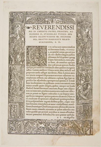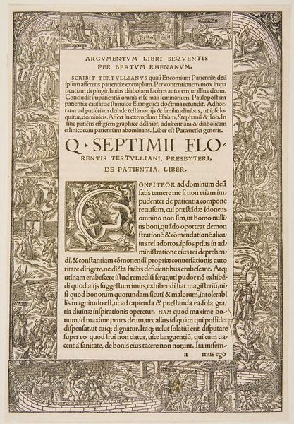 Editor: This is "Genii of the Arts" by Ambrosius Holbein. It's like looking into another world, with all these intricate details framing the text. I'm immediately struck by the sheer amount of activity depicted. What do you see in this piece? Curator: It's an eye-catcher, isn't it? I see a celebration of Renaissance humanism. The putti frolicking around the initial 'V' suggest playful learning. Holbein's use of line and shadow adds depth, almost inviting us into this world of classical ideals. Editor: Putti? Playful learning? I hadn't thought about it that way. So, it's like a window into the values of the time? Curator: Precisely! Holbein is weaving a narrative, one where the arts and sciences are the true path to enlightenment. Makes you wonder what he would make of our world today, doesn’t it? Editor: It does! I'll never look at a framed text the same way again.