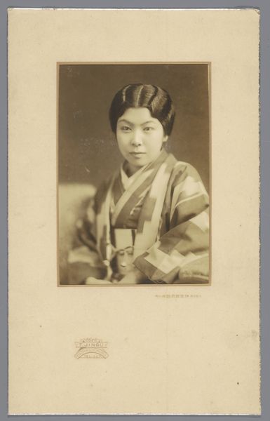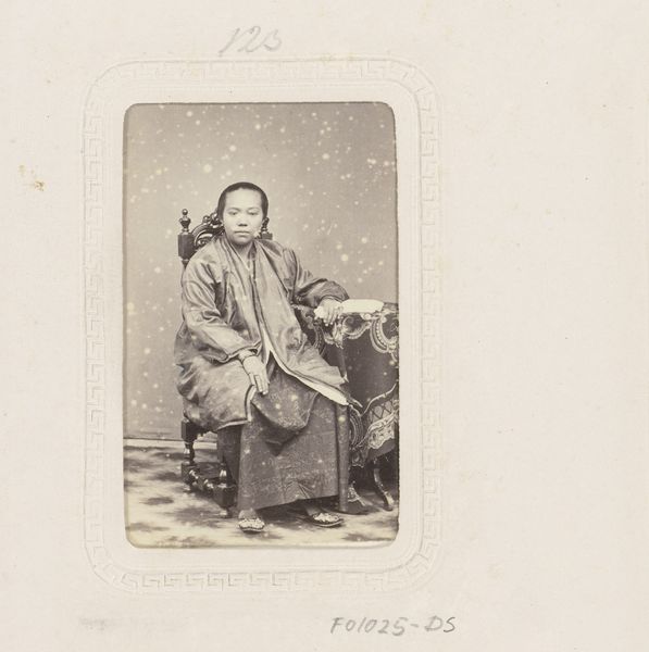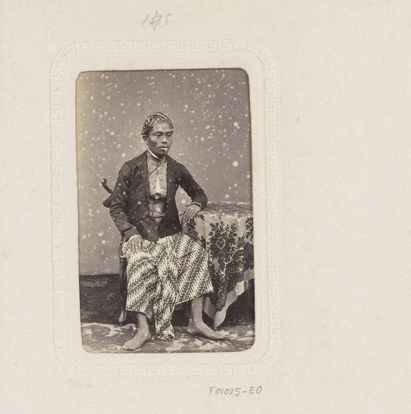 Curator: Stepping closer to this next piece, we encounter an albumen print dating from 1857 to 1880, titled "Portret van een Indonesische vrouw" ("Portrait of an Indonesian Woman"), created by Woodbury & Page. Editor: What strikes me immediately is the dignity. Her gaze, though soft, holds such presence. It’s an interesting quietude in the portrait. Curator: Absolutely. There’s a careful arrangement of layers in this photograph, almost a painted quality despite being a photographic process. It invites such layered consideration about both subject and artistic intervention. Editor: I’m particularly drawn to her garments. That elaborate shawl and patterned skirt...they aren’t just decoration. These are textiles imbued with identity. Perhaps symbols of status or cultural affiliation? It would be interesting to dig into it. Curator: That's precisely what lends photographs like this, which seem like simple portraits at first glance, such richness. The symbolism in traditional Indonesian textiles, like batik, carries complex stories and histories that intertwine with personal and communal narratives. This interplay can often reveal much about the era and the individual portrayed. Editor: It also highlights, perhaps inadvertently, the power dynamic at play. The photographer—a European firm—capturing the image of a colonized subject. It’s a gaze laden with colonial history. But then, the subject herself seems to meet that gaze head on, claiming agency within it, almost contesting it through the meticulous arrangement of clothing. Curator: You’ve hit on such a vital aspect—the unspoken dialogues contained within portraits of this era. Woodbury & Page created so many images, and were aiming for certain representations that also spoke to certain clientele. You know, photography was also quite a commercial business then. I really love what you're spotting and revealing here about power, resilience, and unspoken truths, held, just there in this serene moment. Editor: It makes me think about memory. How do we carry history on our skin, in our clothes, in our eyes? This image is an act of remembering, for both the sitter, perhaps memorializing a moment, and for us, as viewers, confronting history head on. Curator: Agreed. "Portret van een Indonesische vrouw" offers a lens into not only a face but also a history brimming with complex narratives, ready for interpretation and reflection.
