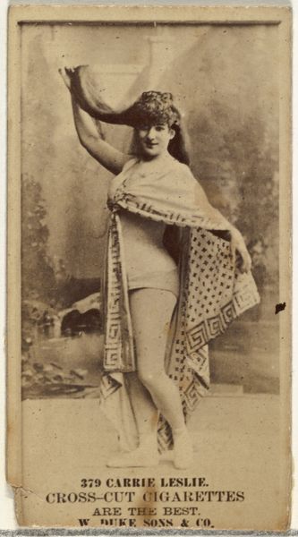 Editor: This is Lola Yberri, a print from the Actresses series made in 1890 by Kinney Brothers to promote Sweet Caporal Cigarettes. The sepia tone gives it such an antiquated, elegant feel. I wonder what draws people to it now? Curator: Focus on the composition; the subtle manipulation of light across the planes of the figure’s elaborate gown and the dark backdrop creates a stage-like depth. How would you describe the interplay between line and form? Editor: The lines are soft, especially outlining her figure, which makes her features seem almost ethereal. The ruffles in the dress, and the curves created by her arm holding the shawl, add so much to the composition. Curator: Exactly. The dynamic curve pulls the eye around the picture plane. But note also how the subtle gradient shifts draw your gaze upward to her face and hat, giving an implicit sense of stature to the sitter. It’s quite masterful, really. The textures in the costume and adornments serve as signs of her class. Editor: That's true, I hadn't considered the symbolic use of material. So the soft lighting, paired with these curving lines and textures… It isn’t just a pretty portrait; it conveys something more, this sort of elevated persona. Curator: Precisely! And it reveals how form follows function, doesn't it? Consider that the Kinney Brothers' intended effect here would have had less to do with artistic merit and more with its utility in commodity branding, but regardless, it's clear the artist took care in translating Yberri's grace to this medium. Editor: That makes so much sense. Looking closer at the visual elements reveals this new dimension of sophistication and strategy. Thank you! Curator: My pleasure. It’s always exciting to rediscover familiar images through new perspectives.