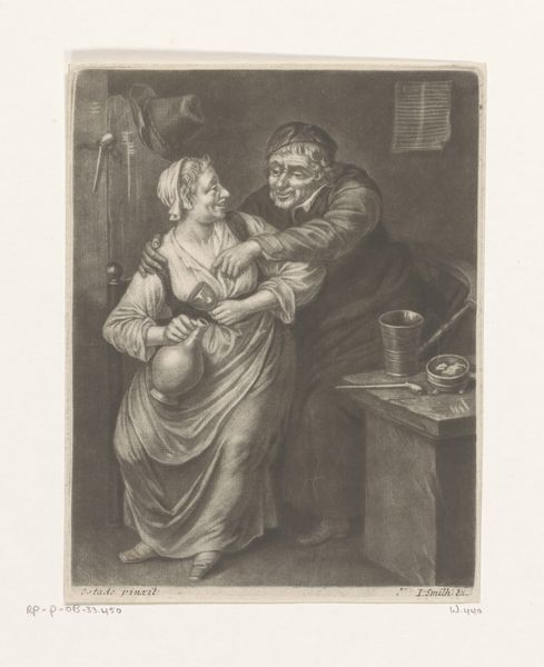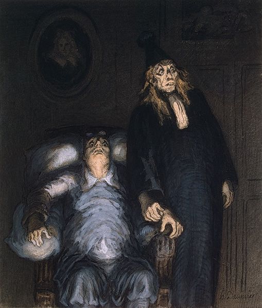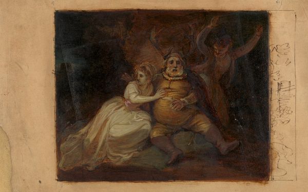Editor: We're looking at Henry Fuseli's "Milton Dictating to His Daughter," painted in 1794 and held at The Art Institute of Chicago. It’s an oil painting, and it strikes me as intensely theatrical, with dramatic lighting that makes it seem almost like a stage play frozen in time. What draws your eye when you look at this piece? Art Historian: Ah, Fuseli! A creature of the night, wasn't he? This painting is a delicious plunge into the romantic agony so popular at the time. Milton, the blind poet, a tragic hero churning out masterpieces through sheer will and his daughter's pen. Look at how Fuseli stages it! Almost gothic, right? That cavernous room, the stark contrasts... He's really selling the drama, isn't he? It feels like the shadows themselves are conspiring. Do you get a sense of Milton as a visionary genius wrestling with his inner demons? Editor: I see what you mean. The lighting emphasizes the figures, especially Milton's almost ghostly pallor, but it feels a bit melancholic. There is a looming feeling that even creativity comes at a price. Is that something you pick up on? Art Historian: Precisely! It’s not a celebration of creation, it is more of an… elegy. The daughters, relegated to the sidelines, eternally copying, a bittersweet existence…Almost as if Milton's brilliance is simultaneously a blessing and a burden. Fuseli’s really poking at that nerve, don't you think? It's less about Milton the literary giant and more about the human cost of genius, perhaps. Editor: That's a darker interpretation than I initially had, but it resonates with the overall somber mood. Art Historian: Well, dear student, art should stir more questions than it answers, wouldn't you agree? Next time you read Milton, see if you detect some of Fuseli's romantic angst. It might just change how you understand the verse. Editor: That’s a fascinating connection! I will definitely do that. This has given me a whole new way to consider Fuseli and Milton's place in the Romantic era.