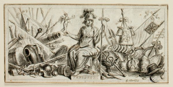 This "Vignet met wapenschild met drie zwaarden" was made by Pieter Tanjé in the 18th century using engraving, a printmaking process that involves incising lines onto a metal plate, inking the plate, and then pressing it onto paper. Engraving demands a deep understanding of materials and tools, reflecting a tradition of skilled craftsmanship. The fine lines and intricate details speak to the artist's mastery over the burin, the tool used to carve into the metal. But the image itself speaks to the social context of its creation. A coat of arms, supported by classical figures and exoticized representations of indigenous people, symbolizes power and authority. The presence of weaponry underscores themes of conquest and control, hinting at the political and economic forces at play during the Dutch Golden Age, when trade and colonialism shaped artistic production. By looking closely at the materials and techniques used, we can understand how craftsmanship and design were interwoven with social and political narratives.