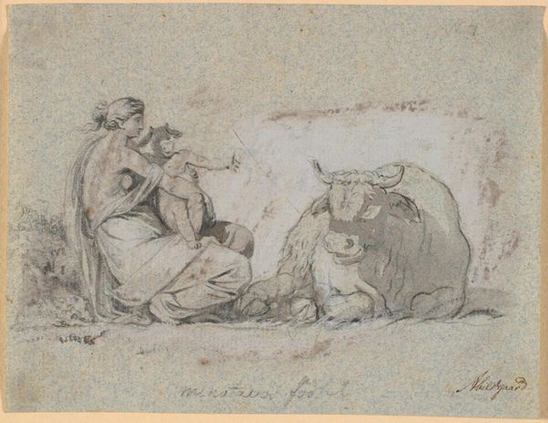 Curator: Today we're looking at "En hyrde med sin hund. Titelblad til \"Geder," a title page created as an etching in ink by Nicolaes Berchem between 1620 and 1683. What's your first take? Editor: A sort of weary contentment. Both figures—the shepherd and his dog—seem to share a quiet repose, like a midday rest under a warm sun. The lines, though delicate, evoke a profound stillness. Curator: Indeed. Berchem was quite adept at capturing pastoral scenes, elevating what would seem mundane into poetic narratives. The etches display this interplay between precision and spontaneity that defined much of Baroque landscape. Take the rendering of the dog's fur—detailed yet free. Editor: The use of line is remarkable. It outlines form and simultaneously creates shadow, providing depth in what could easily be a flat composition. Did Berchem intend this for a larger collection about goats ("Geder" in Danish)? Curator: Exactly! It's a title page meant to evoke this overall theme, a prelude suggesting themes within the other artworks in the series, almost signaling the light-hearted genre scenes that follow within. And his choice to feature the Shepherd suggests a benevolent guardian or keeper of these goats, linking nature with civilization, freedom, and, to be honest, subtle Dutch wealth in farmland animals! Editor: Ah, interesting! It brings so many considerations to mind. A comment on humanity’s place within the pastoral and ideas around simple pleasures! Curator: I agree entirely. This drawing is another peek into the artistic legacy of Berchem that echoes these timeless dialogues. The more you unpack these, the more this image starts to shimmer, doesn’t it?