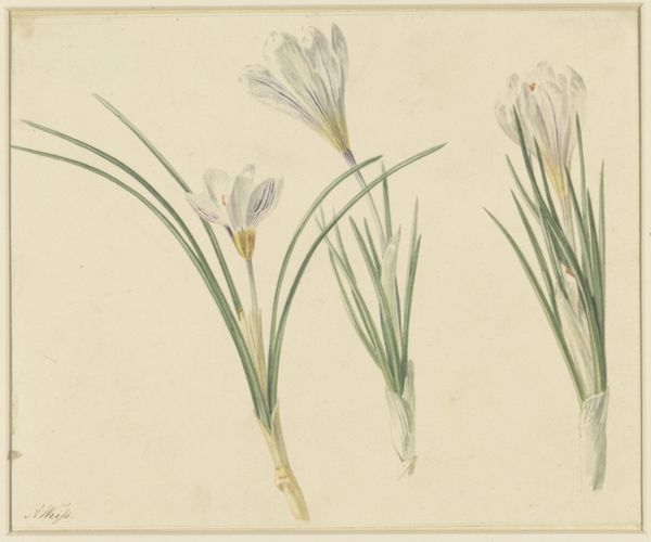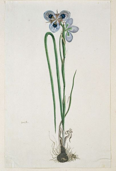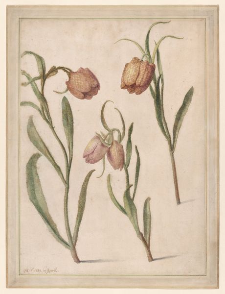 Curator: This delicate watercolor is titled "Checkered Lily (Fritillaria meleagris)" by Pieter Withoos. Editor: It's so precise, yet evokes a sense of fragility. The texture of the paper seems integral to its subdued palette. Curator: Withoos, born in 1654, belonged to a family of artists, and his botanical illustrations were highly sought after. These drawings were often commissioned for scientific documentation. Editor: Interesting. The level of detail suggests a clear purpose beyond mere aesthetics; it reveals a deep engagement with the natural world and the labor involved in studying it. The materiality of the plant is almost tangible. Curator: Absolutely. Consider how botanical art played a role in shaping scientific knowledge. The politics of observation, classification, and the very act of preserving nature through art were significant. Editor: A lovely piece. It makes one consider the intersection of art and science. Curator: Indeed, it provides valuable insight into the cultural value placed on botany and natural history at that time.