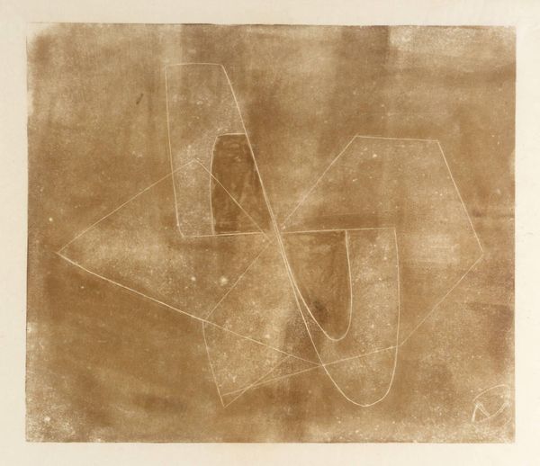 Editor: Here we have an untitled print by Naum Gabo. The geometric forms against the textured background feel very architectural to me. What historical conversations do you think this piece might be having? Curator: Considering Gabo's constructivist background, it’s impossible to ignore the sociopolitical context. The Russian Revolution aimed to dismantle class structures and empower the proletariat. Gabo's non-representational forms were a radical attempt to create a universal visual language, accessible to all regardless of social standing. Do you see it that way? Editor: That's interesting! So, it's not just about aesthetics, but also about social change? Curator: Exactly. It's about challenging traditional artistic hierarchies and imagining a more egalitarian society. The question is, does it succeed? Editor: I hadn't thought about it that way before. It definitely adds another layer of meaning to the work. Curator: Indeed, it highlights art's potential as a tool for activism and social commentary. Editor: Thank you, I will be reflecting on this.