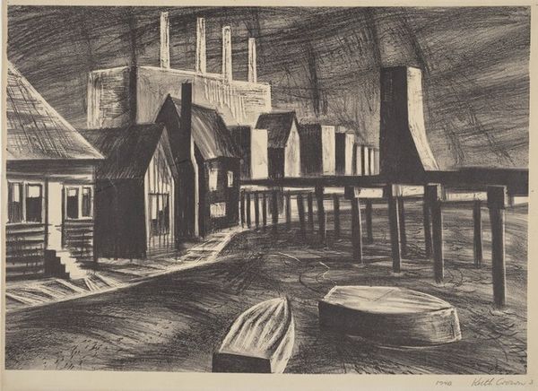 Curator: We’re looking at “The Artist’s House in Arles,” an ink drawing made by Vincent van Gogh in 1888. Editor: My initial reaction is a sort of claustrophobia, despite the cityscape. The heavy, horizontal lines used for the sky, coupled with the dense, stippled ground, create a flattening effect, trapping the architecture. Curator: It’s interesting you say that. Focusing on the formal elements, I'm struck by the interplay between line and texture. The regularity of the hatched sky contrasts dramatically with the almost frenzied dots covering the ground, leading the eye to explore the scene. The structure is well-balanced with orthogonal lines that add symmetry, as well as strong perspective to define the city-scape. Editor: That perspective also seems forced somehow. Consider the social context of van Gogh's time in Arles. He yearned to create a community for artists, “The Yellow House" became the center of intense, ultimately failed collaboration with Gauguin. Doesn't the tension in this rendering, its stifled atmosphere, reflect his struggle for acceptance and belonging? Look at how isolated the figures are, scattered on the landscape and on the streets. Curator: Perhaps, but I see the figures as elements that add a point of focus. I am fascinated by the variety of strokes used. The carefully placed vertical lines building up the buildings themselves stand out against the loose gestural work, animating this urban space. Editor: But urban space it certainly is. How do we see the increasing industrialisation and urban development through this single image? Look at the bridge barely suggested in the distance. How are the marks we are describing hinting to more extensive contexts and societal anxieties of the 19th Century? Curator: Van Gogh masterfully manipulated the contrast between dark ink and negative space to suggest form and light. Through varied densities and arrangements, there’s an intrinsic quality about the artist, which invites us to look into these details. Editor: I can definitely see those points and that is undeniable in Van Gogh’s expression of inner turmoil but beyond his personal emotions, the drawing might reflect universal feelings of alienation amidst rapid societal changes. A glimpse into the past, but it feels deeply present today.
