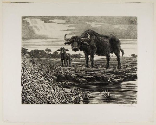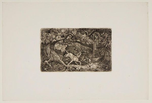 Editor: Here we have Friedrich Anton Wolff’s print, "Wild Boar and Dog." It’s a busy little scene. The texture almost vibrates off the page! What leaps out at you? Curator: Oh, the dance of light and shadow! It's a micro-drama, isn't it? The dog, alert, juxtaposed with the boar, perhaps at rest or... not. What does that say about our assumptions of nature's harmony versus its raw reality? I wonder if Wolff had a particularly prickly hunting trip in mind. Editor: That's interesting! I was so caught up in the detail, I missed the bigger picture of predator and prey. I'll definitely look at it differently now.