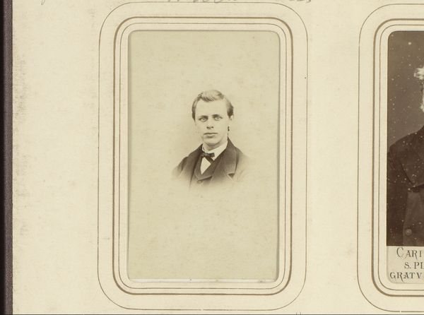 Curator: This captivating portrait before us, known as "Portret van een vrouw met bril," was captured sometime between 1867 and 1885 by Christiaan Martinus Jan Hermelink. It is a gelatin-silver print, a process which rose to popularity in the latter part of the 19th century. What is your first reaction to the photograph? Editor: My eye is drawn immediately to the oval frame, giving this woman an almost ethereal quality. I am wondering what her medallion might symbolize. Curator: It is striking how a seemingly mundane object like a pair of glasses, front and center, becomes so fascinating when understood through the development of photography and print-making techniques. The rise of gelatin-silver prints offered unprecedented detail at an affordable cost, making images like these, with all their nuances, more accessible. The details of her clothes, glasses, everything…it is the fruit of significant labor. Editor: Exactly. Glasses could be seen as a signifier of knowledge, social standing, and perhaps even intellect. They draw my eye and I wonder about the woman who is presented. Is she a scholar, an intellectual? Does this photographic representation of her say anything of cultural views? Curator: It most certainly says a lot of cultural norms in the context of the Victorian era, with the subject's composed presentation reflective of middle-class values and standards of the day. In those years, new technologies emerged. These facilitated image consumption, influencing a booming market that brought photographic portraiture within reach of new sections of the population and promoted ideals about modernity, personal branding, and beauty. Editor: Seeing her positioned inside this decorative border within the album reminds us, too, of how the photo exists as a kind of precious artifact, part of a story, of memories being deliberately preserved. A deliberate curation, then and now. Curator: Indeed, thinking about the material object that carries that image adds a layer of understanding beyond pure aesthetic or even iconographic analysis. Consider all the labour involved to manufacture the photographic support, process the print. That opens further research areas: labour history, commodity distribution, etc. Editor: So much more than just an old photograph. I agree! Curator: Certainly. I found it enriching to contextualize the economic dynamics inherent in this everyday portrait, especially given my materialist perspective. Editor: And for me, considering what the elements in the portrait may tell us about the subject provides meaning to the viewing experience. Thank you!