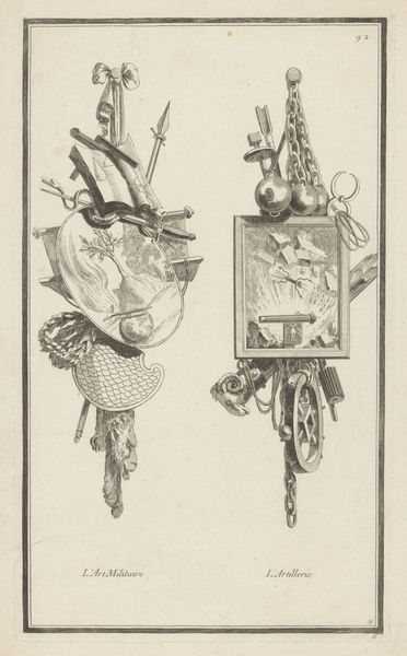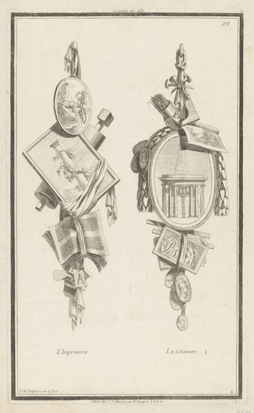 Jean Charles Delafosse created this print titled "Schilderkunst en poëzie", or "Painting and Poetry," in the 18th century. It’s part of the collection at the Rijksmuseum. The image presents allegorical representations of painting and poetry, framed within decorative cartouches typical of the Neoclassical period. These motifs reflect the era's emphasis on order, reason, and the revival of classical art forms. Consider how the image creates meaning through visual codes: the artist uses established symbols to celebrate the arts, reinforcing their cultural value in French society. During the 1700’s, institutions like the Royal Academy played a crucial role in shaping artistic standards and tastes. Delafosse’s work reflects this institutional influence, but we can also think of how artists of the time questioned these establishments and how the politics of imagery either supports or disrupts these institutions. To delve deeper, consider researching the role of art academies in 18th-century France. Examining period texts and critical responses to Delafosse’s contemporaries might reveal the nuanced social dialogue this print engages in.