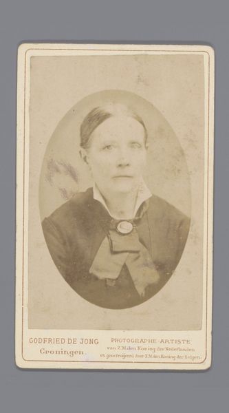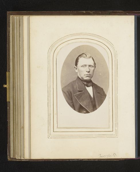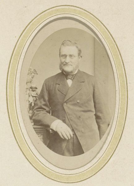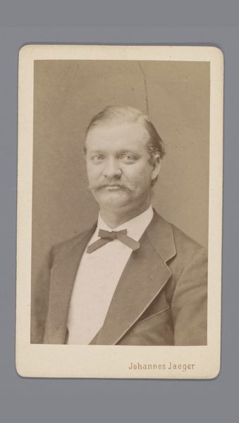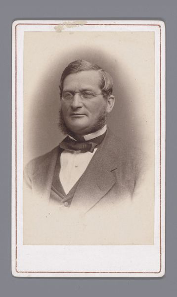 Curator: Here we have a rather striking albumen print from between 1871 and 1885, "Portret van een onbekende man, aangeduid als dr. Heamskog" by Bernhard Hakelier. Editor: It's quite intimate, even though it’s of someone unknown. The oval frame emphasizes the subject’s face and the formality of the period. Curator: The albumen print technique lends it that warm sepia tone, softening the image while retaining crisp details in his clothing and features. The use of albumen provides this sense of depth and texture, it’s remarkable. Editor: I agree! The texture gives a feeling of stepping back in time. What always strikes me about old photos is how they capture a stillness, a quiet solemnity that feels miles away from our present selfie culture. Curator: Indeed. Semiotically, his clothing– the tailored jacket, bow tie – these function as signs indicating respectability and social standing, typical of portraits of that era. Note how the lighting accentuates the planes of his face, directing our attention to his eyes and expression. Editor: You almost want to ask, what are you thinking about? His gaze feels thoughtful, like he's pondering some grand idea or maybe just his grocery list. I wonder about Dr. Heamskog; he exudes a blend of intelligence and melancholy. What secrets does his face hold? Curator: It’s the ambiguity that's intriguing, the tension between what is revealed and what remains concealed. Editor: And isn't that what good art, of any era, is all about? This humble albumen print lets us have that very debate! Curator: A potent example of portraiture and a valuable contribution to our understanding of visual culture from that time. Editor: Definitely gives one food for thought, indeed.
