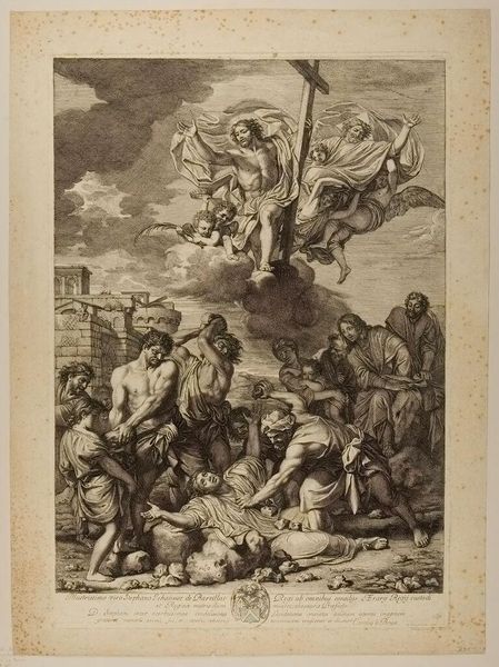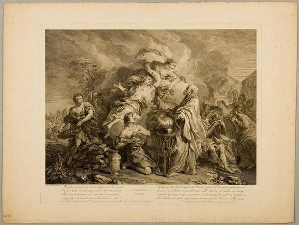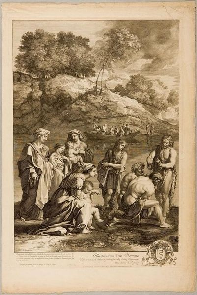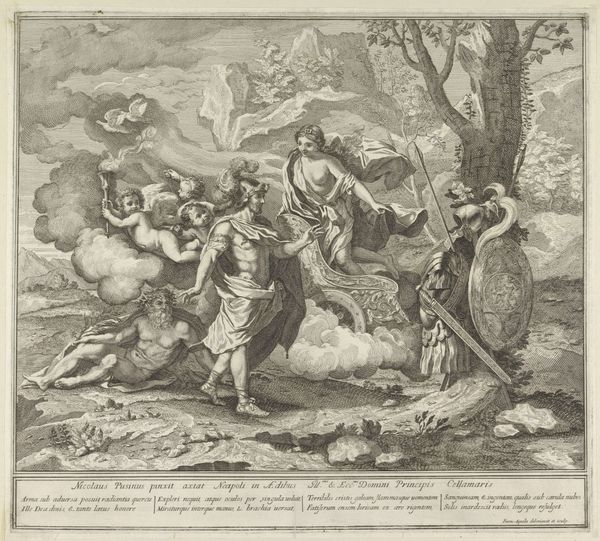 Curator: This engraving, titled "Flight into Egypt," is by Gèrard Audran and depicts a pivotal moment in the New Testament. Editor: There's a striking sense of stillness here, despite the supposed urgency of the flight. The angel's commanding gesture seems to freeze everything in place. Curator: The artist masterfully uses light and shadow to guide our eyes. Note how the angel's form is radiant, contrasting with the darker tones surrounding the Holy Family. Editor: Absolutely, the light underscores the divine intervention. It's an interesting tension—a vulnerable family guided by undeniable power. The weary traveler is a universal symbol. Curator: Indeed. Audran is reminding us that even in times of fear and uncertainty, hope and guidance are always present. Editor: A timeless reminder, beautifully captured. It gives you goosebumps.