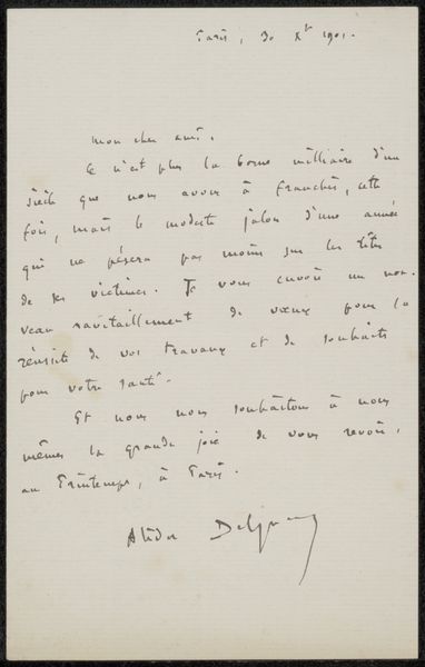 Curator: Welcome. Here we have "Brief aan Philip Zilcken" a letter by Alidor Delzant, likely from between 1900 and 1924. It’s rendered in ink on paper. Editor: My initial impression is of intimacy. The handwriting, the personal nature of a letter…it feels very close, very human, despite the temporal distance. And I like the overall composition; it makes it readable even for those with vision impairments. Curator: Intimacy is certainly key here. Alidor Delzant, though lesser known, was part of the artistic circles exploring more intimate and personal themes at the turn of the century. The act of writing a letter itself, at that time, was a curated expression of thought and self. Editor: I am particularly interested in how the medium—ink on paper—itself becomes part of the message. The quality of the ink, the texture of the paper, even the pressure of the pen stroke – all contribute to the overall feel. How was this paper produced? What type of ink? Where? It would deepen our connection to this artwork if we looked at the whole manufacturing context. Curator: Absolutely. The choice of materials reflects a deliberate intention. Delzant was engaging with the very culture of correspondence, something of social significance at that time. The handwriting is particularly telling - it has the quality of something crafted. Letters carried enormous social weight at the turn of the 20th century, more than they do in the present time, when a letter can just be printed by a machine, or better yet, just replaced with email. Editor: And that craft, the penmanship itself, hints at the author's state of mind and dedication to the process. In many ways the material process *is* the art. Without pen and ink, you wouldn’t have it. Also, to my mind, by putting up something so ephemeral as an intimate letter to be appreciated, in a public gallery like this, makes this display an interesting interplay between the public and the private domains. Curator: Delzant is engaging with a very ephemeral yet deeply important human activity: Writing. It tells you that there were modes of communications that are quite different to how people are talking today. Editor: This small glimpse into the communication methods and materials that Delzant used give insights into a rich and engaging historic moment.