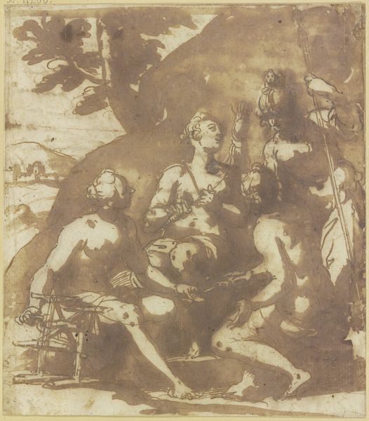 Curator: We’re looking at “Rinaldo and Armida,” a drawing by Giovanni Baglione. Its execution probably falls somewhere between 1566 and 1643, and it now resides here at The Met. Editor: Wow, this has that dreamy, slightly unsettling vibe. Everything kind of swirls together—figures, architecture, clouds. A sensual daydream, maybe? Curator: Precisely. Baglione is illustrating an episode from Tasso’s epic poem "Gerusalemme Liberata.” It depicts the sorceress Armida enchanting the crusader Rinaldo in her magical garden. These narratives, and especially the exoticizing lens they adopted were hugely popular at the time, fueling imaginations and reflecting complex attitudes toward the “Orient.” Editor: "Enchanting" is putting it mildly! He looks completely out of it, lolling there like a marble Adonis while she's crowning him with flowers. Talk about giving up control! What's interesting is the passivity they are both radiating: they both appear more as characters in a drama that is unfolding around them and less like autonomous subjects making decisions for themselves. There's a subtle tension, isn’t there, between vulnerability and control? Curator: Absolutely, that tension is central. Think about the artistic conventions being employed. Baglione’s source material in both classical and renaissance precedents dictated not just the narrative elements, but the overall compositional structure, what one *should* depict when exploring such subjects, especially as this impacted male authority and anxieties around female power. It mirrors how European authority asserted dominance over foreign bodies, yet they became enthralled by those same bodies! Editor: I guess you’re right. And then you see the cherubs hovering above, cupid down below...are these a playful innocence of childhood—or more active participation? It feels as though those cherubic faces may as well have been adult voyeurs staring on the tableau. Curator: These are carefully placed elements that reinforce and complicate the central themes. They serve as witnesses, underscoring the very public drama of private desires. I mean, this really exemplifies the historical entanglement between art and power in the period after the Council of Trent. Editor: You’ve certainly given me more to ponder here. I was taken in by the beautiful scene but failed to appreciate the depth it has underneath the immediate appeal. Curator: Well, it speaks to how artists engaged with classical themes but then loaded them with contemporary meaning. I appreciate you engaging with that complexity, while I appreciate the artist's attention to details with pen and ink, something the photo on the wall here does not provide at the moment.