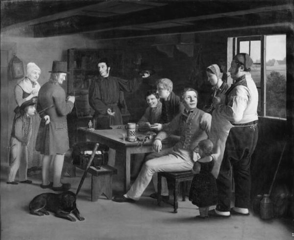 C.A. Lorentzen painted "Den politiske Kandestøber, II akt, 2. scene" using oil on canvas, though the date is unknown. The scene is structured around a table, the focal point of the painting, which is brightly lit and draws the eye into the center. The composition and arrangement of figures creates an interesting interplay between light and shadow, enhancing the dramatic tension of the narrative. Note how Lorentzen uses stark contrasts and tonal variation to define the forms and characters in the scene. It serves not only to illuminate but also to isolate, emphasizing the distinct reactions and emotions of each individual to the unfolding drama. The structural contrast between the figures and the relative simplicity of the background allows for a semiotic reading where the viewer is invited to decode the signs of social critique embedded within the painting. It’s not just an aesthetic tableau but a complex visual text inviting multiple interpretations. Consider the way the artist uses formal elements to engage with philosophical ideas.