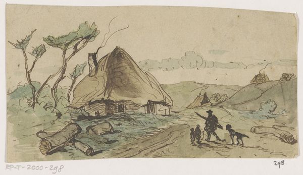 Curator: Welcome. Before us hangs "Heide in Noord-Brabant met huisjes," created between 1840 and 1870 by Johannes Tavenraat. It’s currently held here at the Rijksmuseum. The medium appears to be watercolor and drawing on paper. Editor: Immediately, I’m struck by the earth-toned palette. It’s mostly shades of brown, which gives the piece a melancholic, almost austere quality. And note the texture rendered throughout, a palpable, almost haptic sense of landscape. Curator: Absolutely. Let's consider the social context of Tavenraat's era. The rise of Romanticism greatly influenced landscape painting, emphasizing the emotional and spiritual connection to nature. Such rustic scenes often depicted an idealized version of rural life, responding to increasing industrialization. Editor: Observe the composition, how Tavenraat divides the picture plane. The eye is led first through the figures and ground textures in the foreground, and ultimately resolves at the thatched-roofed building as a focal point—the horizon of course is muted by these forms. It creates an asymmetrical balance that keeps it engaging. What could you say of that from your perspective? Curator: Well, structurally, it’s fascinating to consider Tavenraat’s use of line. He articulates the houses, sky and inhabitants with rapid and loose lines. The overall effect, as you said, creates depth through this application of hatching, activating what is, quite frankly, a monochromatic illustration. Editor: Precisely, but isn’t this very constructed nostalgia itself implicated in broader political shifts? Land ownership and class divisions surely factored into both the appeal and creation of such bucolic imagery. There is social criticism at play too I think. Curator: I can see that argument, yes. It does raise questions about the idealization of poverty, though the scene feels honest in its details. Editor: Well, looking again, that might very well be an intentional and careful placement of forms, leading towards this sort of social commentary... Curator: Ultimately, the artwork provides a unique glimpse into 19th-century Dutch rural life, presented with a captivating level of technique that cannot be overstated. Editor: I’m now seeing how those textures are a form of communicating the difficult work of the peasant classes too. Thanks to Johannes Tavenraat for this subtle work and thanks to this institution that keeps the cultural memory alive!