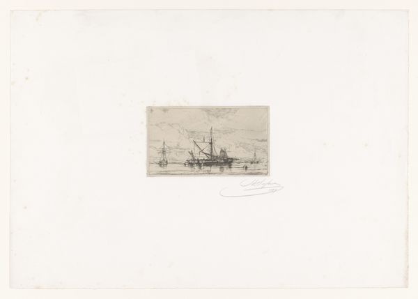 Curator: Welcome. Before us we have “Varende roeiboot en zeilboten,” a print by Jan Dam Steuerwald, created sometime between 1825 and 1863. Editor: There’s a quiet stillness to it, isn’t there? The boats almost mirrored on the water, the muted tones... it feels very serene, yet somehow also heavy with unexpressed emotion. Curator: Precisely. Look at the detail in the print, though – the textures of the clouds, the gentle ripple of the water. It draws you into this seemingly ordinary scene. One can almost smell the briny air, imagine the rough texture of the boat under your fingers, no? Editor: Absolutely. The production of prints like these speaks to the increasing accessibility of art in the 19th century, no longer solely the domain of the wealthy. But also look at the paper it's printed on, consider its journey – where was the linen sourced? How much labor was involved in turning that raw material into a substrate fit for image making? Curator: A fine point! Perhaps these genre scenes appealed precisely because they depicted a kind of idealized common life. And to consider the materiality reminds us these scenes often masked harsher realities. Editor: The romanticism here can almost feel… ironic. The focus on idyllic watercraft elides questions of the shipbuilding industry and its implications for trade and possibly conquest. Are we seeing leisure, or the fruits of something less picturesque? Curator: A pertinent question, definitely offering pause for deeper thought. I had simply been swept away in the quietude of it all. It makes one reflect on how much our understanding depends on the frame we choose. Editor: And on the material world that produces those frames. Thinking about where things come from brings so much more depth. It is a somber piece. Curator: Indeed! Let’s move along, shall we? The perspective is truly quite unsettling now!