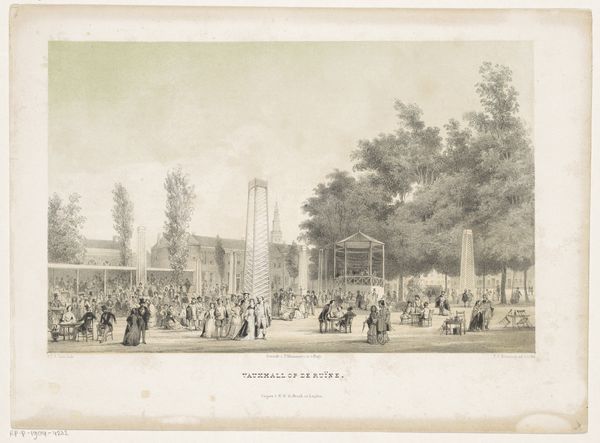 Curator: I'm drawn immediately to the dynamism in this image. A sense of excitement pervades. Editor: You've keyed into the perfect emotional descriptor. This is "Eerste treinrit op het spoor bij Brussel" (First Train Ride on the Brussels Railway), a print dating back to 1835 and credited to Paulus Lauters, currently held in the Rijksmuseum's collection. Curator: It reads as an incredibly hopeful image. I mean, look at that eager crowd; each figure feels like an embodiment of future possibility and technological promise. Note also the balance: the orderly city fading into soft, dramatic clouds that hover over a dense assembly of townspeople celebrating some industrial "revolution." I am quite drawn in by how the landscape informs the narrative! Editor: Precisely. Consider how railway openings became highly staged public events in the 19th century, laden with sociopolitical implications. Think of the rail lines not just as tools for transport, but symbols that were believed to embody societal progress and national unity. The train embodies forward momentum—quite literally— and visually that forward motion is enhanced by this technique known as linear perspective which drives the eye. Curator: Ah, but observe more closely at what's not apparent. I am particularly interested in who is—and who isn’t— present. Editor: The fashionable attire of many attendees indeed indicates a certain social stratum. These openings were about celebrating what "could be," but the benefits would hardly be immediately accessible to all. Lauters' choice to position the town in the background certainly offers fodder for pondering. What continuities from that period echo today in our perception of technological advancement? Curator: It is also an amazing chronicle, and it prompts deeper questions. It makes one think about our enduring impulse to locate pivotal junctures in time, and to remember how innovations become inextricably connected with what, and whom, they leave in their wake. It gives rise to endless considerations of continuity through visual records. Editor: I agree entirely. Looking closely, it illuminates so much about both the spectacle of progress and the subtleties of social narrative during its era, reminding us to always interrogate not just what we celebrate, but how and why.