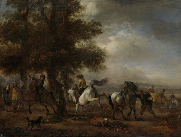 Curator: Well, doesn’t this scene just breathe… weariness? "A Soldier’s Return," painted by George Morland, hits you right in the gut. That winter landscape—icy grays and blues—just conveys a sense of bone-chilling fatigue. Editor: Precisely, the romanticization of labor here is thick. Consider the pigment choices—ochre and umber, grounded pigments readily available at the time, building a somber, realist tone but for consumption by a leisured class far removed from such hardship. Note also, this “return” presumes an ongoing war machine, necessitating an endless procession of “returns,” each a potential disruption to social order. Curator: Hmm, disruption. You're looking at it with such a cynical eye! I see… relief? Okay, a fragile hope then. Look at the way the figure on the right is leaning on his walking stick. Every muscle in his body seems to be sagging with exhaustion, but the cottages just beyond, however humble, offer… sanctuary. That and what is presumably his family following nearby. Editor: But even that “humble” cottage – look at the thatch. Thatching requires a specific set of skills, locally sourced materials – likely rushes, reeds or straw cultivated on communal lands. Access to such materials and the skills to utilize them point to a complex web of social and economic relationships. A cozy picture masking a world of dependency. Curator: (chuckles) Oh, you are determined to pick it apart! Maybe you are right and Morland consciously wanted to show that these family relationships come after years of toiling in the battlefields. Though, it has me wondering, was he perhaps trying to appeal to emotion, aiming for patronage that glossed over underlying struggles, instead? Editor: Potentially, though given Morland’s later debts, that idealized outcome may not have worked. Regardless, viewing art like this asks us to examine not just the final product, but the socio-economic forces driving the hand of the artist. It invites us to investigate supply chains, to analyze labor, and to decipher the narratives that underpin artistic expression. Curator: A fitting return in itself; so maybe what appears to be an image of exhaustion or return, really shows the perpetual, often hidden toiling that fuels everything that we create, critique and observe.