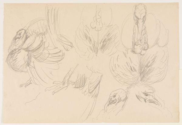 Curator: We're looking at a drawing by Henk Henriët, made sometime between 1936 and 1940. It’s a pencil and frottage piece entitled "Drinkende reus, twee figuren, een gezicht met een vogel in het haar en het gezicht van een man," currently held at the Rijksmuseum. Editor: Well, immediately I’m struck by the tentative quality of the lines and the strange juxtaposition of scales. There’s an ethereal, dreamlike feel that's difficult to shake off. Curator: The loose sketch style certainly contributes to that. The figure on the left, presumably the "drinking giant," is rendered with visible layers and rubbed textures from the frottage technique, creating depth and form. Henriët experiments here, breaking the conventional form of portraiture. Editor: And what's fascinating is the lack of clear narrative. Who are these figures, and what’s their relationship? Is it a reflection of societal hierarchies, with the 'giant' looming large, dominating these almost caricatured smaller figures? Or perhaps a commentary on the individual versus the collective? Curator: Potentially. Consider that this drawing emerged during a period of immense social upheaval. Surrealism, with its focus on the subconscious and the irrational, offered a visual language to express the anxieties of the pre-war era. The fragmented composition mirrors a world feeling increasingly unstable. The use of frottage here isn't accidental. It suggests an attempt to unearth something hidden, like revealing the latent tensions within the social fabric. Editor: Yes, the roughness, even ugliness, in rendering conveys tension effectively. However, if we isolate the bird emerging from hair – an unusual visual choice – what meaning do you ascribe to that formally? Curator: I see it as a powerful surrealist gesture: unexpected forms placed in new relationships destabilize perception. As to social meaning: Birds often represent freedom and escape, and I think juxtaposing it to human visage reveals a yearning during restrictive times. Editor: I agree that the overall composition creates a dreamlike sense of disorientation and quiet unease that reflects the unsettling nature of the times. It highlights the psychological toll of witnessing social breakdown and coming upheaval. Curator: Precisely. Thank you for offering new thoughts about Henriët’s technical achievements and historical contexts, providing visitors with more insight into the artwork.