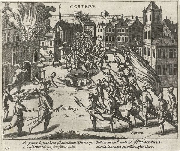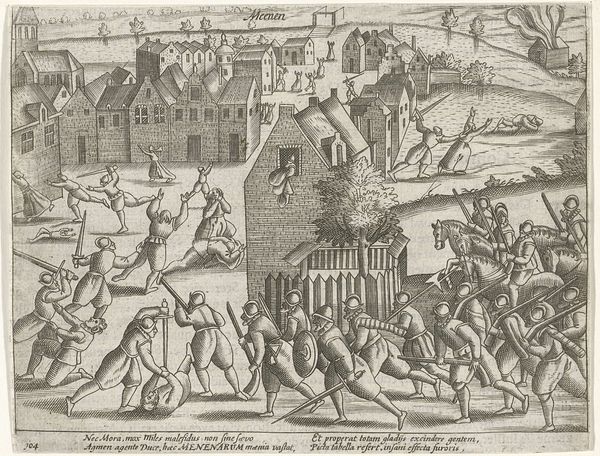 Curator: Here we have an engraving, likely created between 1613 and 1615, known as "Franse Furie te Antwerpen, 1583." It depicts the Sack of Antwerp. Though anonymous, its detailed linework is quite striking. Editor: It certainly is intense. Even in this small scale, you feel the chaos and violence jumping out at you. Look at the diagonals—they create such a sense of instability and unease. Curator: Yes, the composition funnels your gaze toward the center, amplifying the event. Note how the artist employs a dense network of intersecting lines, typical of the Baroque printmaking tradition, to generate a highly detailed scene. We observe not only the architecture of the city but also a complex array of figures rendered with clarity. Editor: It's chilling to see that level of detail applied to such brutality. This wasn't just some distant event; people lived, suffered, and died here. The "Franse Furie" or French Fury, wasn’t just about French troops; it involved a complex web of political intrigue where Antwerp, a hub of commerce and religious tolerance, became a pawn. Seeing it visualized in such a seemingly neutral style—with its emphasis on clear lines and spatial accuracy—is almost unnerving. Curator: Precisely. The visual tension arises from this contrast: a meticulous rendering of utterly barbaric action. Consider the figures; each is anatomically correct. There’s an almost scientific precision in their portrayal, which elevates the piece from simple documentation to something more profoundly disturbing. The balance of tones creates visual interest. Editor: Balance perhaps aesthetically, but there's little moral balance here. What happened at Antwerp exemplifies how religious wars tore apart communities, forcing people to choose sides when survival was often just a matter of chance. Works like this challenge us to reflect on how such systematic violence has continued across time and place. Curator: I concur. It is a fascinating synthesis: refined technique utilized to explore and portray violence. A print of visual interest and of substantial art historical value. Editor: Yes. Ultimately, “Franse Furie te Antwerpen, 1583” reminds us to confront the past. Only by studying events such as these we might avoid repeating these egregious mistakes in the present and in the future.