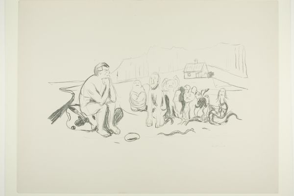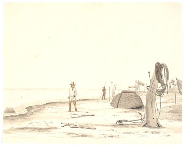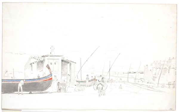 Editor: We are looking at "Fiskere på Skagen losser både ved stranden," a drawing made with pencil from 1847, by Martinus Rørbye, currently exhibited at the SMK. It really conveys the hustle and bustle of a day by the sea. What do you see in this piece, what aspects jump out at you? Curator: Oh, it sings to me of a day dream. Rørbye’s captured not just a scene, but the memory of one, wouldn't you agree? The scattering of figures almost float. It feels less about perfect rendering, and more about capturing a fleeting moment. Have you noticed the top figures seeming suspended in the white of the page like dreams? Editor: That’s an interesting take! It felt grounded to me, almost documentary-like. I guess the loose sketching feels like movement. What do you think he's aiming to capture through these choices? Curator: Perhaps it’s about embracing the beauty of everyday life? Skagen, with its wild seas and working folk, offered him an escape from academic artifice. Those sketches in the upper register feel to me like echoes – reminders of human toil, seen against the vast backdrop of nature. Aren't they sublime and humble at once? It really makes me wonder about our own connections to nature now. Editor: It really brings that perspective to life! Seeing it as capturing a dream-like escape really shifts how I look at it, more about feeling than pure representation. Thanks for that insight! Curator: And thank you. It’s wonderful how art invites us to find new vistas in the old.