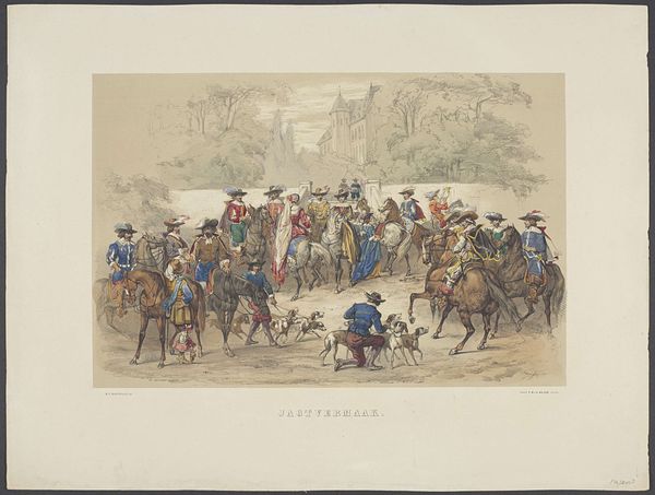 Editor: Here we have Otto Eerelman's "Groningse maskerade van 1859: Engelse groep," made in 1859. It seems to be a print or etching depicting a historical procession. The atmosphere feels quite formal, almost theatrical. What strikes you most about this work? Curator: The layers of historical reenactment, even within the 19th century, intrigue me. It's not just a history painting, but a performance *of* history. We need to think about why people in 1859 felt the need to represent this "English group." What specific power dynamics were they engaging with, and perhaps subtly re-writing? The pageantry, the costumes… It all speaks to a very constructed identity. Do you notice anything in their attire? Editor: Yes, it's so detailed! Some wear dark, formal robes, others are in bright colors. I'm guessing these details signify rank, maybe even political affiliations? Curator: Precisely! And how might those sartorial choices reinforce or challenge social norms of the time, both in the era being depicted *and* in 1859? Think about who had access to these kinds of lavish displays and, equally importantly, who did not. We should examine not only their material wealth, but also any specific visual messaging these costumes intend to relay to viewers then—and us, today. Editor: So, it’s more than just a pretty picture. It’s about understanding the message conveyed to different audiences based on their social position. Curator: Exactly! Consider who might have commissioned or viewed this print, and how their interpretation would differ from those excluded from such displays of power. Editor: This has shifted my perspective. It is an exercise of selective history! Curator: Yes! Artworks are social texts reflecting cultural anxieties, values, and power structures of particular moments in time. That perspective can offer very potent insights!