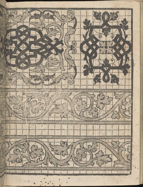 This is page four from Iseppo Foresto's "Lucidario di Recami," created around the mid-16th century using woodcut in Italy. At first glance, the dense interplay of black lines against the off-white paper creates a striking visual texture, both decorative and functional. Note how Foresto employs a grid structure as the foundation for his elaborate patterns. This underlying order is crucial: it offers a framework upon which more organic and curvilinear motifs can playfully interact. The tension between the rigidity of the grid and the fluid, almost whimsical nature of the interwoven knots and foliage creates a dynamic visual dialogue. Consider the way the artist uses positive and negative space. The black lines define shapes, but equally important is the unprinted space that breathes life into the design, allowing the eye to navigate this complex composition. This interplay challenges any singular, fixed reading, instead inviting ongoing visual exploration and interpretation.