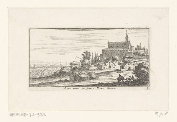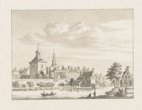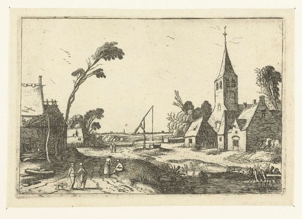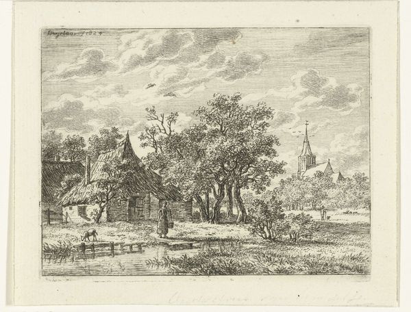 "Gotisk Kirke" is an etching made by Johan Bülow, sometime between the late 18th and early 19th centuries. Bülow was born into the landed gentry and served as a knight in the Order of the Dannebrog, so his position within Danish society afforded him the freedom to pursue artistic interests, such as this one. The print depicts an idyllic scene of rural life complete with a gothic church, a bridge, and various figures. It subtly engages with the prevalent artistic trends of its time, such as Romanticism which emphasized the beauty of nature and the sublime power of religious architecture. It represents an idealized vision, where class divisions seem softened by the shared experience of the natural world. The detailed etching technique captures the textures of the trees and the stone of the church, inviting viewers into this tranquil landscape. This artwork serves not just as a visual representation but as a cultural artifact. It reflects the values, aesthetics, and social structures of the time, quietly inviting us to consider the historical narratives embedded within.