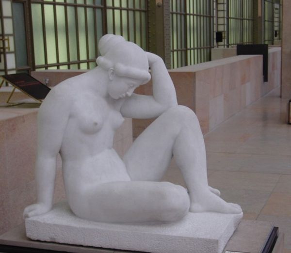 Aristide Maillol made this bronze sculpture, The Mountain, as an exploration of the human form. It’s interesting how he renders the figure almost as a landscape, emphasizing the weight and volume. There’s a sensuality in the way the light catches the curves. The surface isn’t smooth or polished but has texture, little bumps and indentations that seem to mimic skin. Look at how her hand rests on her head – the fingers aren’t detailed, but you get a sense of the pressure, the weight of the arm. The way the light falls gives the work depth, making her feel both solid and yielding. Maillol was part of a generation grappling with the legacy of Rodin and moving towards a more simplified, classical form, not unlike what Picasso was doing in painting around the same time. It’s like they were both digging back into history to find something new. Art is a constant conversation, isn't it? Always looking back, always moving forward.