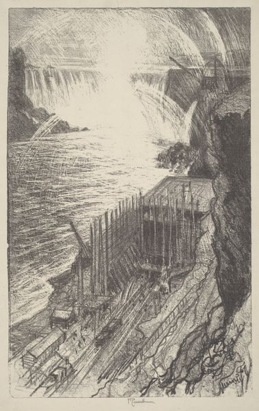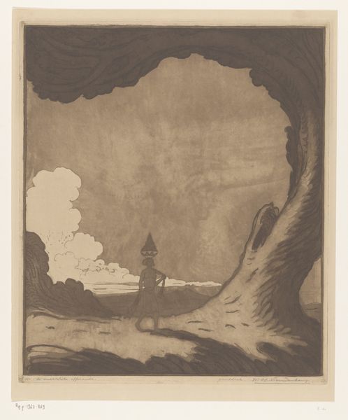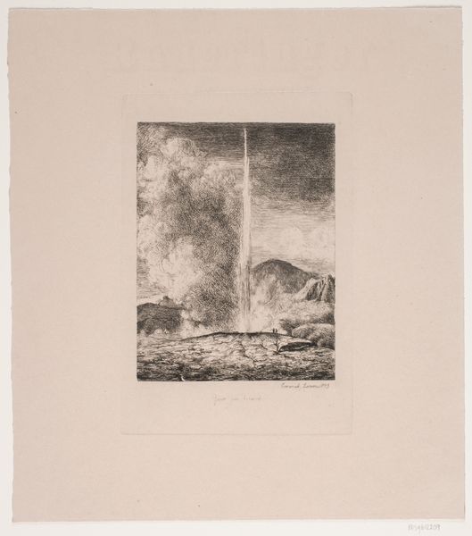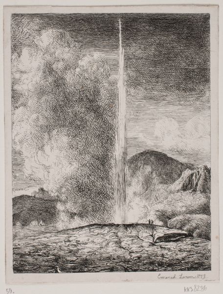 Emanuel Larsen created this print of an Icelandic geyser using etching in 1849. Etching involves covering a metal plate with a waxy, acid-resistant ground. The artist then scratches an image into the ground with a needle, exposing the metal. The plate is then immersed in acid, which bites into the exposed lines, creating grooves. The character of those lines has everything to do with the image we see. Look closely: the stark verticality of the geyser is achieved by dense parallel strokes, lending it a monumental quality. Note how Larsen contrasted that regularity with the more chaotic hatching used for the sky and landscape. This contrast speaks to a wider tension, between the sublime power of nature, and the tools humans use to represent it. Etching, while indirect, still demands careful skill, labor, and a sensitivity to the materials. It’s this interplay that gives the print its enduring fascination, reminding us that even the most awe-inspiring sights are always mediated by human hands and ingenuity.