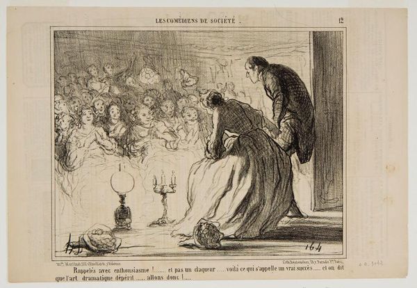Curator: This is "Une maîtresse de maison du marais..." by Honoré Daumier. The lithograph presents a staged performance before an audience. Editor: The linear quality is remarkable! See how Daumier uses hatching and cross-hatching to create depth and volume with simple strokes? It gives it a frenetic energy. Curator: Indeed! And this frenetic quality mirrors the satirical intent. Daumier was known for lampooning the bourgeoisie and their social pretensions. The print's title speaks volumes about competing with the established theatre. Editor: Absolutely. The composition is brilliant—the stark lighting isolates the performers, drawing our attention to their exaggerated gestures. A masterclass in line and form! Curator: It's more than just form. Consider the social context! Daumier’s print provides insight into the cultural dynamics of 19th-century France. Editor: A compelling interplay of technique and societal critique. Curator: Precisely!