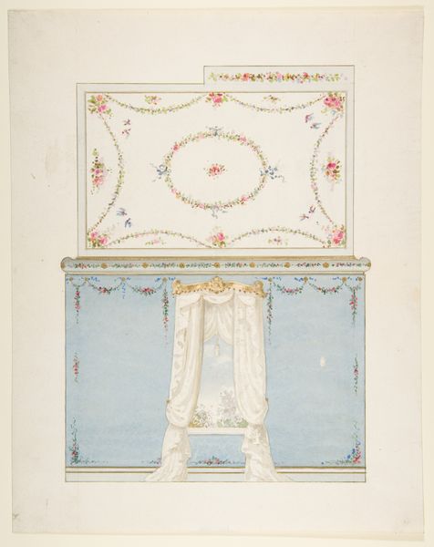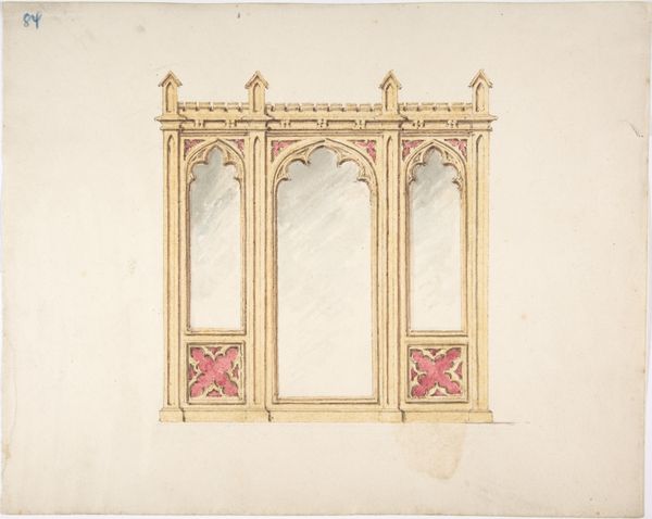 Curator: We're looking at "Design for Altar and Chapel, Farnborough," an architectural rendering from sometime between 1880 and 1886. It's currently housed here at the Metropolitan Museum of Art. Editor: Immediately I’m struck by its serenity. The delicate watercolors give it such a soft, ethereal quality. It’s the color of whispers. Curator: Absolutely. I get a strong sense of reverence. Lachaise really knew how to build a world with humble pencil, print, and watercolor. Editor: The architecture itself, those grand gothic windows, wouldn’t be out of place in the medieval period. You almost wouldn’t notice how labor-intensive the actual making of the stained glass windows were, not to mention the time devoted to drawing such detail, which is now just decorative. Curator: Right. And I imagine this was all very much meant to impress, given the almost gaudy adornments crowning the whole thing. The crown, coat of arms, fluttering ribbons... it’s almost aggressively opulent! But it doesn't overwhelm. It complements. Editor: Absolutely. It strikes me, though, that Lachaise has flattened the picture space, really focusing on surface decoration. It’s less about spatial depth, and more about the layers of design applied to a two-dimensional space. What statement does that approach convey to you? Curator: It certainly creates a sense of... removal. Like viewing devotion from behind a pane of glass, quite literally. And even though it’s only a proposal on paper, it evokes the many levels of planning, skilled work, the various economies, that go into designing for worship. I imagine commissioning this room would be the ultimate devotion in itself, and the final version would speak for its own creation in a grand church. Editor: True. This is a fascinating meditation on what goes into the experience of designing for devotion. Seeing the artwork makes you want to meditate and understand. I like the quiet it gives.