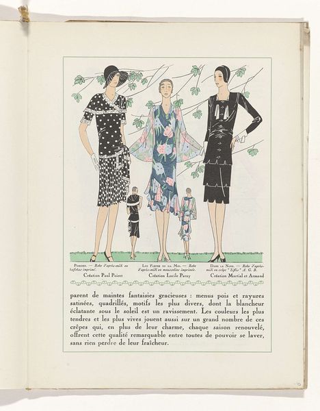 Editor: This watercolour drawing, “Art - Goût - Beauté…” from 1929, is a page from a magazine of the era and feels very much of the Art Deco period. I’m drawn to the detailed lace work on the dresses. What can you tell me about the social impact of this piece? Curator: It’s fascinating to consider this as a piece of cultural ephemera. These kinds of fashion plates weren't simply about aesthetics, but also about dictating and democratizing taste. The availability of these images in magazines influenced what women aspired to, particularly within the rising middle class. Think about the role this played in constructing and reinforcing social norms surrounding femininity and elegance. Editor: So it was less about individual expression and more about conforming to a standard? Curator: In part, yes. The fashion industry and publications like this actively shaped ideals, but it’s also more nuanced. Women used fashion to negotiate their identities within these imposed structures. How does this image tie into broader discussions around women's changing roles in the 1920s? The looser silhouettes, the emphasis on movement – how does this reflect or challenge existing societal norms for women at the time? Editor: It's amazing how something as seemingly light as a fashion plate could hold so much social and historical significance. It makes you consider who held power then, and how it continues to impact the way fashion is viewed now. Curator: Exactly. By studying such "minor" art forms, we gain deeper insights into the mechanisms through which taste is manufactured and consumed.