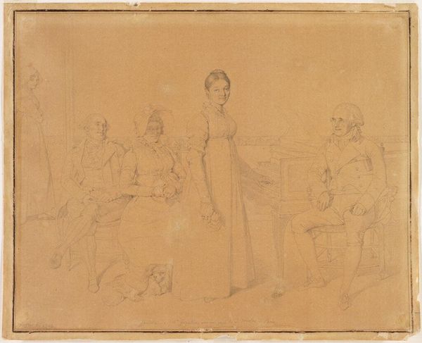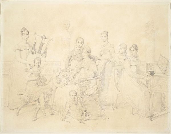 Curator: Looking at this unassuming pencil drawing, "Familiegroep, vermoedelijk naar een zeventiende-eeuws schilderij," by Johannes Bosboom, created between 1827 and 1891, what are your immediate impressions? Editor: It evokes a sense of subdued observation, as if peeking into a scene from a bygone era. There's a delicacy and stillness. But this muted approach seems to quiet questions regarding their status and roles, too. It feels exclusionary in its lack of access, which itself says quite a bit about representation in that era. Curator: Precisely. The composition leads us directly into the arrangement of figures, paying close attention to the light as it defines form. Note how Bosboom masterfully captures the fall of light on their faces, particularly highlighting the textures and elaborate detailing in their clothing. Editor: These choices aren’t merely artistic, but carefully staged moments, echoing class and propriety. The deliberate recall to the 17th century suggests an ongoing claim to a particular lineage, almost performing the historical narrative the sitters seek to belong to. I'm left wondering who these people were—their privileges are implied, but identities remain obscure. Curator: That obscurity invites a formal examination. Observe the spatial arrangement. The composition is tightly controlled, creating a sense of depth through overlapping forms. This invites analysis of line quality, tonal gradation, and attention to proportion; the use of light and shadow creates visual interest, which directs our gaze strategically within the plane of the drawing. Editor: Perhaps by engaging critically, we can bring light to their concealed positions and understand how even unfinished sketches reinforce hierarchies and ideologies. We must bring nuance to understanding their historical position within art. Curator: Well, it underscores how technical choices shape our engagement with history. It's the interplay between these aesthetic qualities and the depiction of his subject matter that elevates this piece, wouldn’t you say? Editor: Absolutely. Considering all of the implications, it is indeed powerful to bear witness.